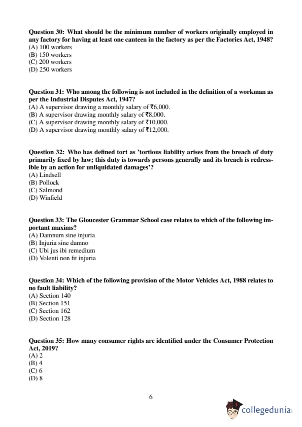 | 30.What should be the minimum number of workers originally employed in any factory for having at least one canteen in the factory as per the Factories Act, 1948? (A) 100 workers (B) 150 workers (C) 200 workers (D) 250 workers |