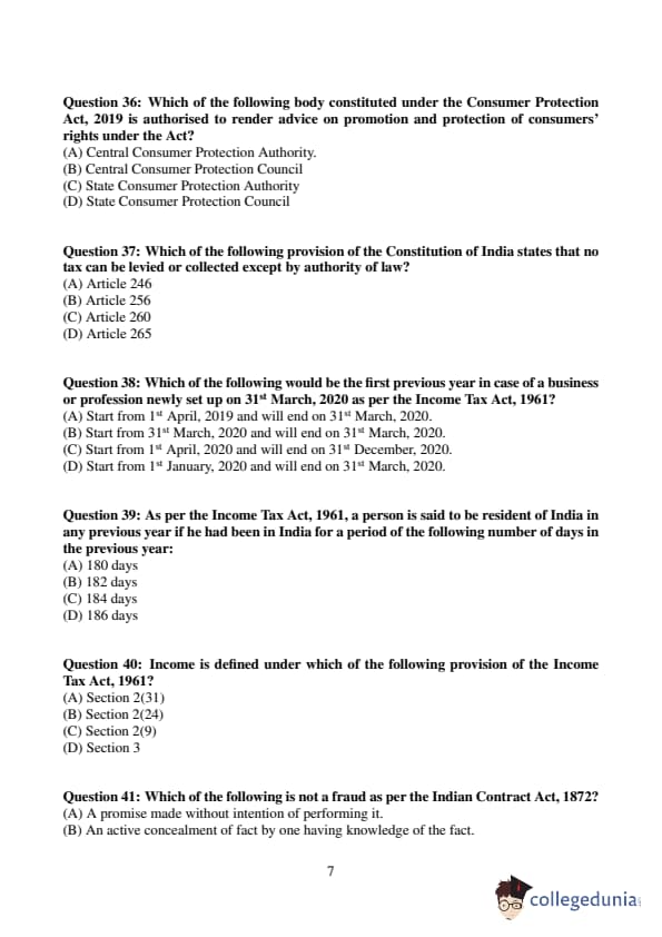 | 39.As per the Income Tax Act, 1961, a person is said to be resident of India in any previous year if he had been in India for a period of the following number of days in the previous year: (A) 180 days (B) 182 days (C) 184 days (D) 186 days |