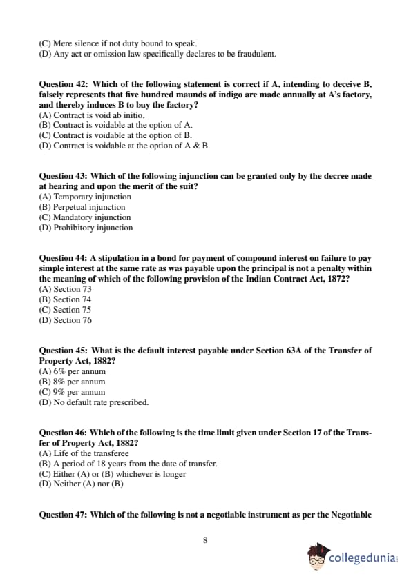 | 45.What is the default interest payable under Section 63A of the Transfer of Property Act, 1882? (A) 6% per annum (B) 8% per annum (C) 9% per annum (D) No default rate prescribed. |