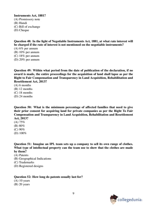 | 47.Which of the following is not a negotiable instrument as per the Negotiable Instruments Act, 1881? (A) Promissory note (B) Hundi (C) Bill of exchange (D) Cheque |