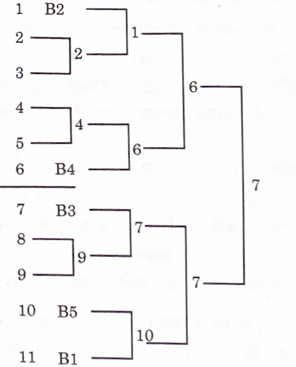 In a fixture with 11 teams, there are 5 teams with byes (B2, B3, B4, B5, B1). These teams automatically advance to the next round without playing. The remaining teams (6 teams) are the non-bye teams that play against each other in the first round. Quick Tip: A team that receives a "bye" does not participate in the initial round and automatically advances to the next stage of the tournament.
