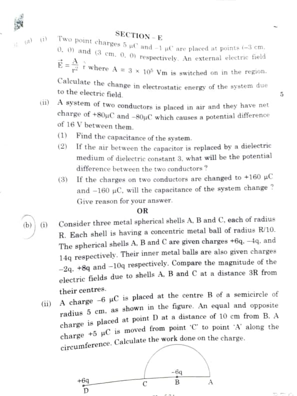 (b) (i) Consider three metal spherical shells A, B, and C, each of radius \( R \). Each shell is having a concentric metal ball of radius \( R/10 \). The spherical shells A, B, and C are given charges \( +6q \), \( -4q \), and \( +14q \) respectively. Their inner metal balls are also given charges \( -2q \), \( +8q \), and \( -10q \) respectively. Compare the magnitude of the electric fields due to shells A, B, and C at a distance \( 3R \) from their centres.