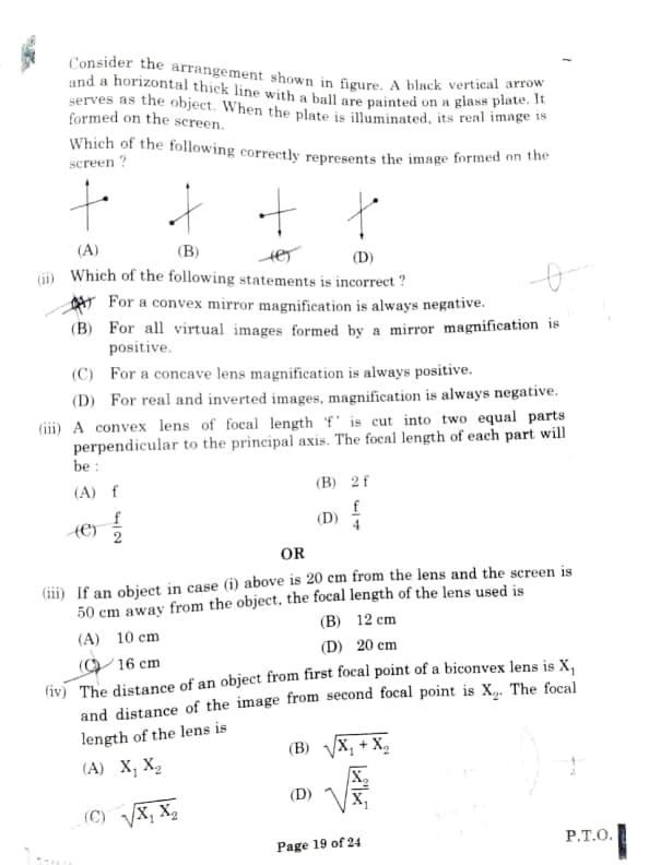 (iii) If an object in case (i) above is 20 cm from the lens and the screen is 50 cm away from the object, the focal length of the lens used is: