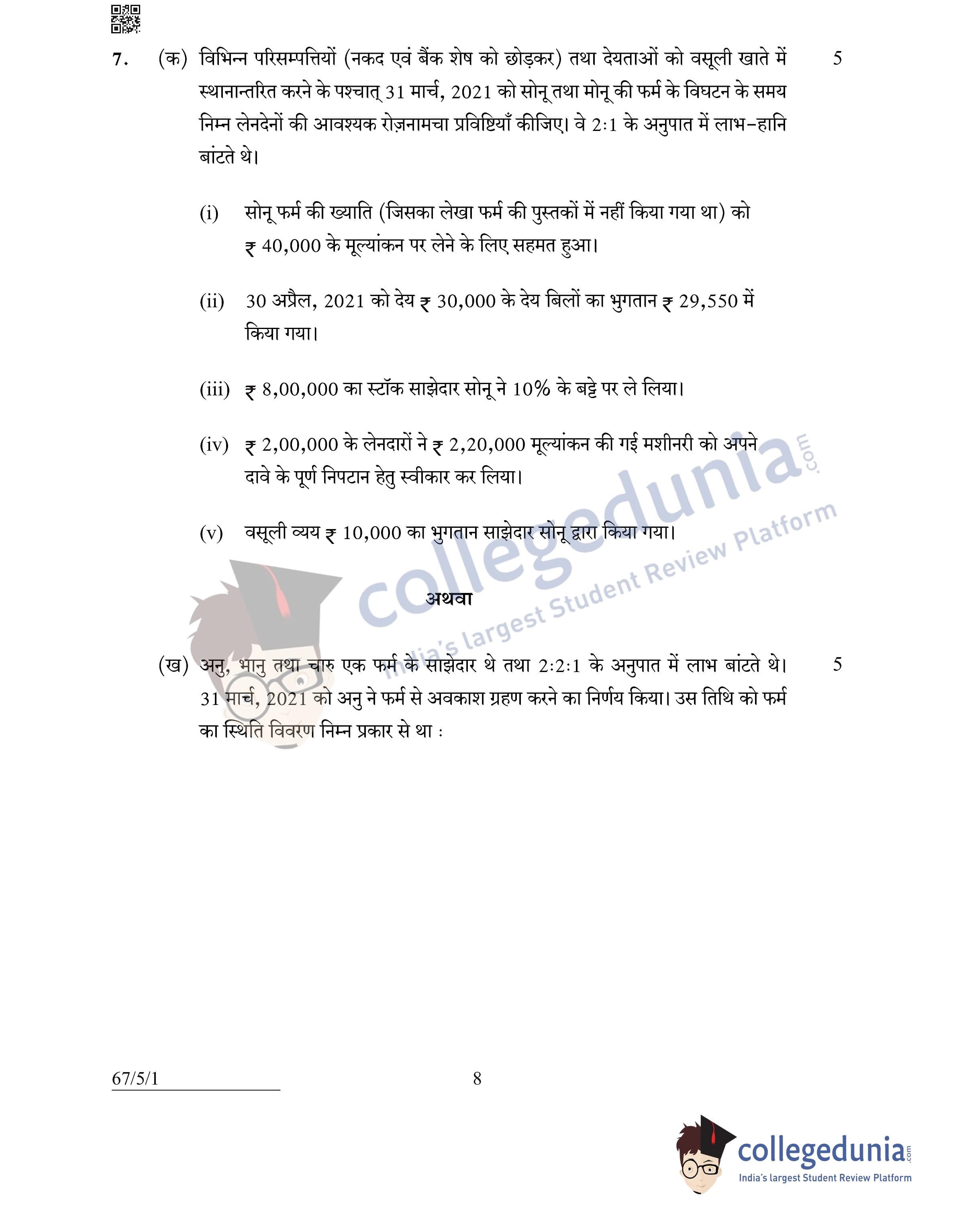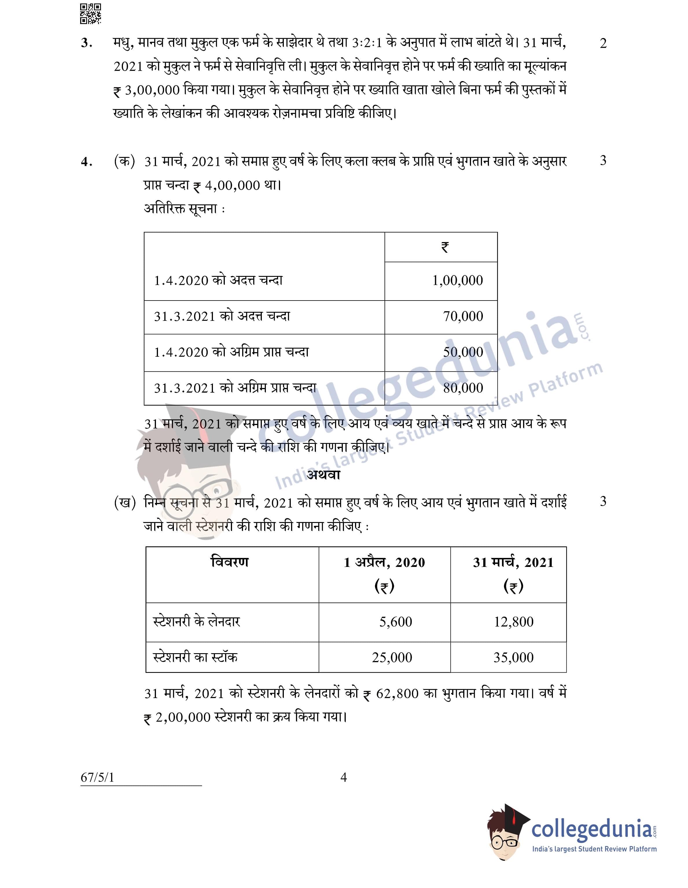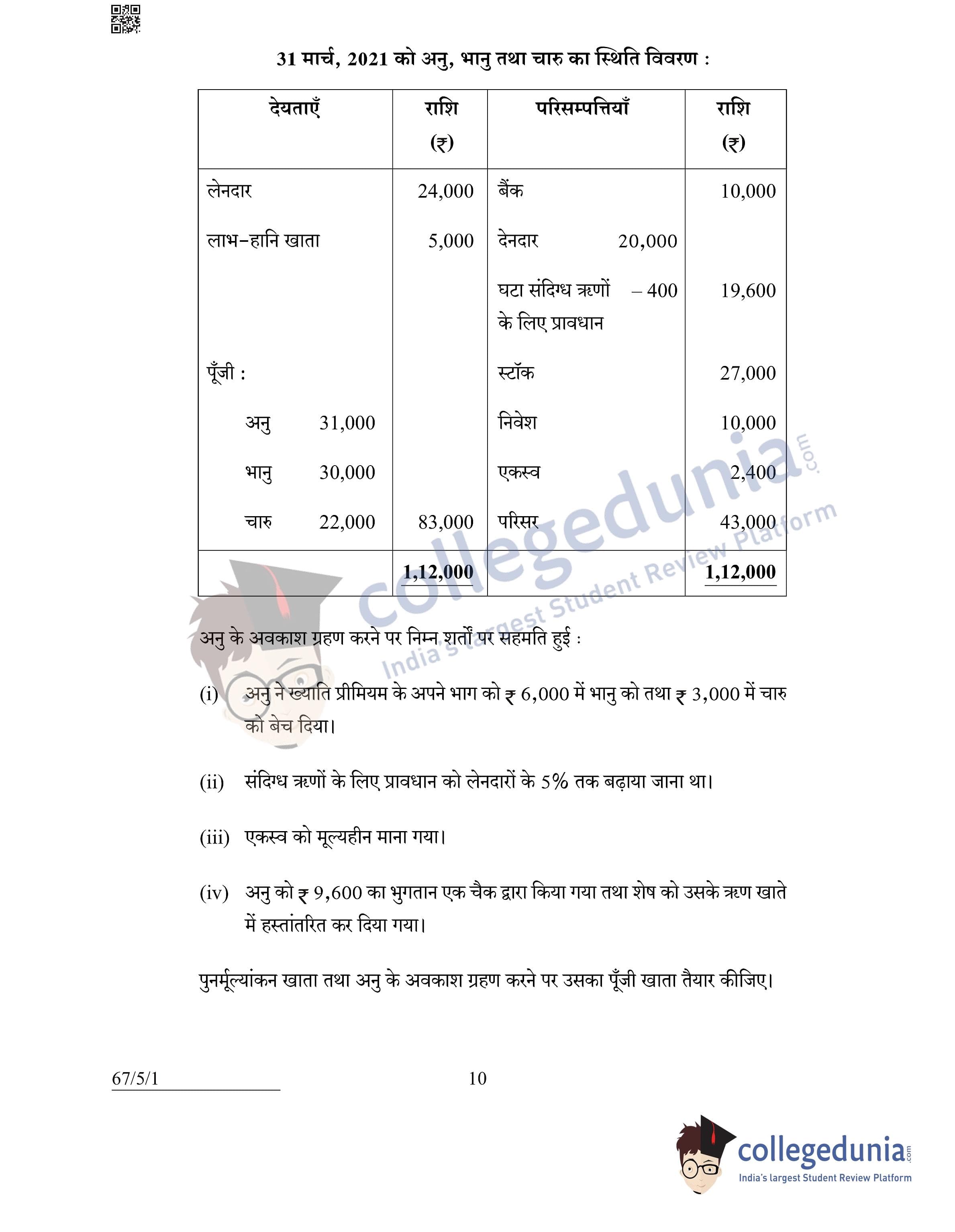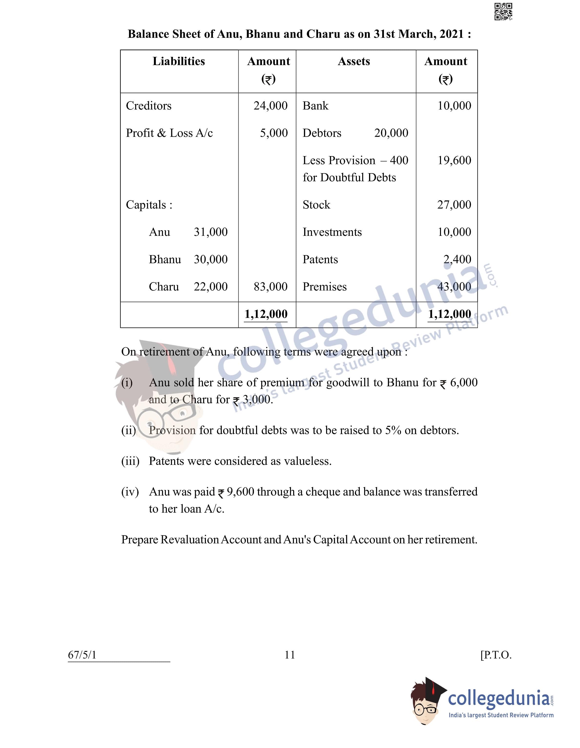 CBSE Class 12 Accountancy Question Paper 2022 with Answer Key (May 23, Set 1 - 67/5/1- Morning Session)