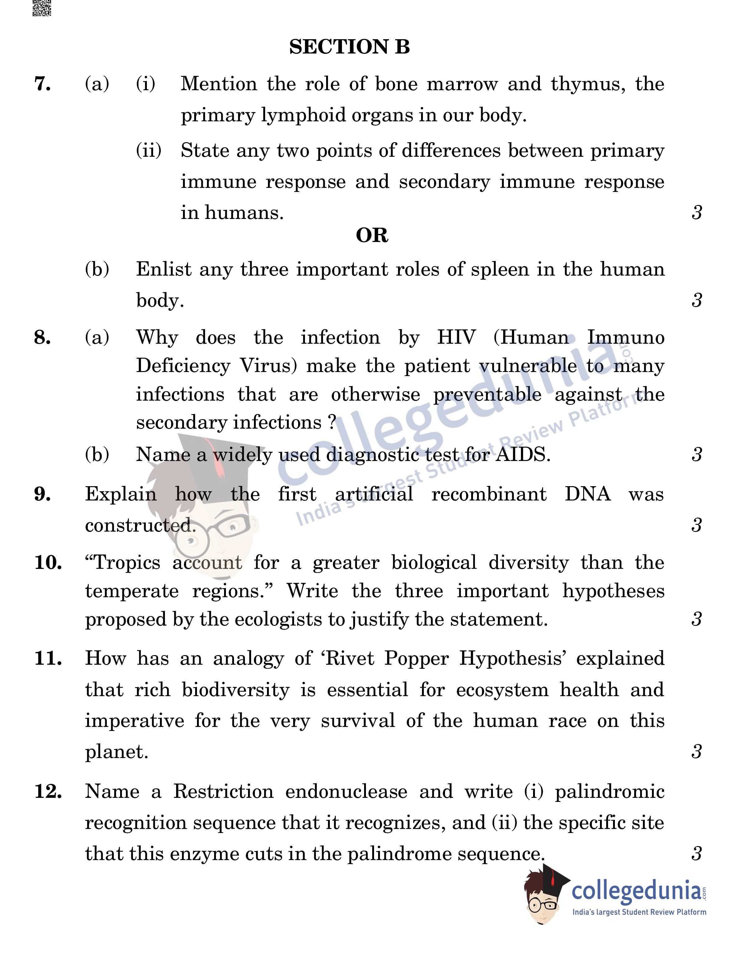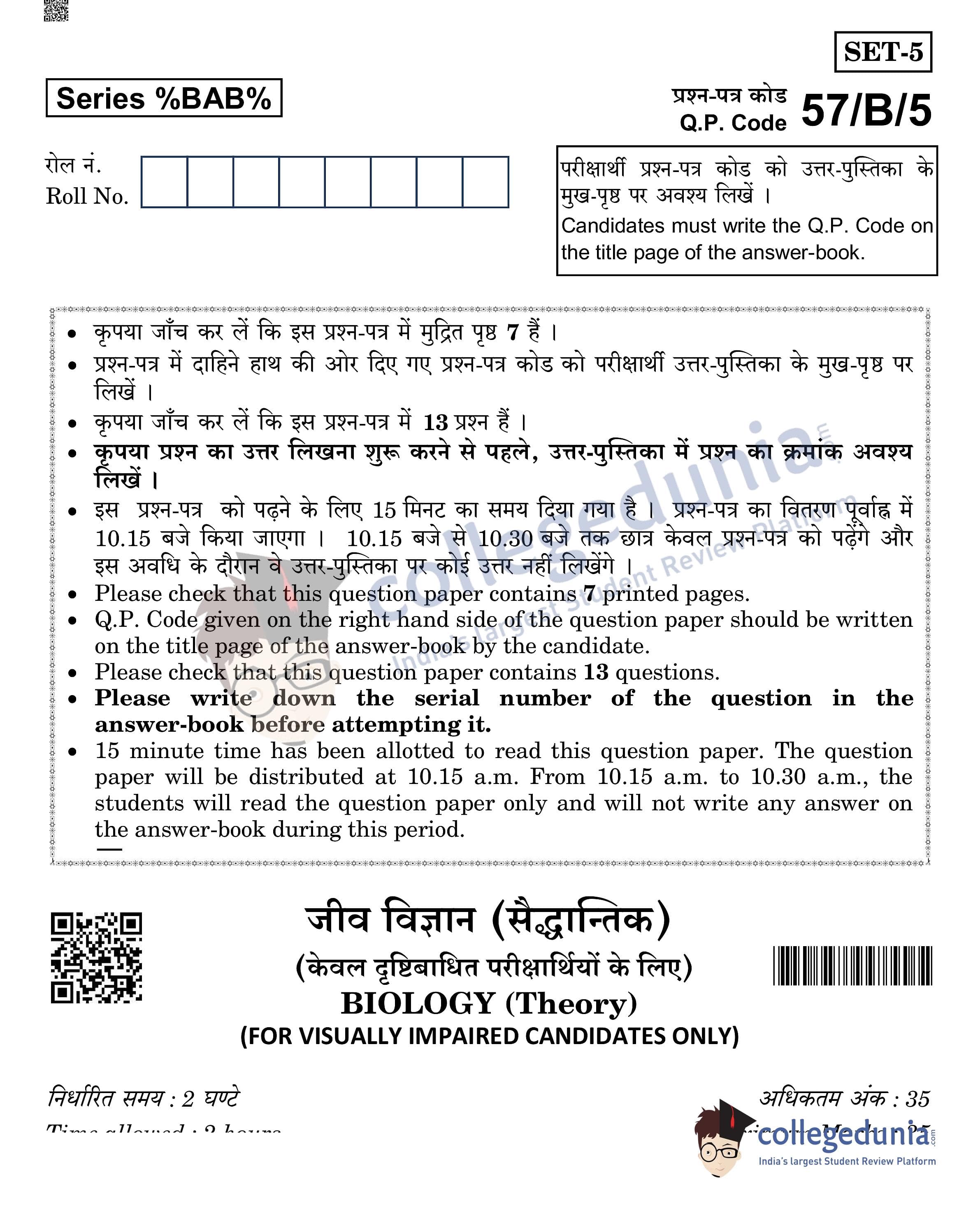 CBSE Class 12 2022 Biology(Visually Impaired) Question Paper Set 5 - 57/B/5 with Answer Key pdf is available for download. The exam was conducted by Central Board of Secondary Education on May 30, 2022 in the Morning Session 10:30 AM to 12:30 PM. The medium of paper was English & Hindi. In terms of difficulty level, CBSE Class 12 Biology(Visually Impaired) paper was of Moderate level. The question paper comprised a total of 13 questions divided among 3 sections.