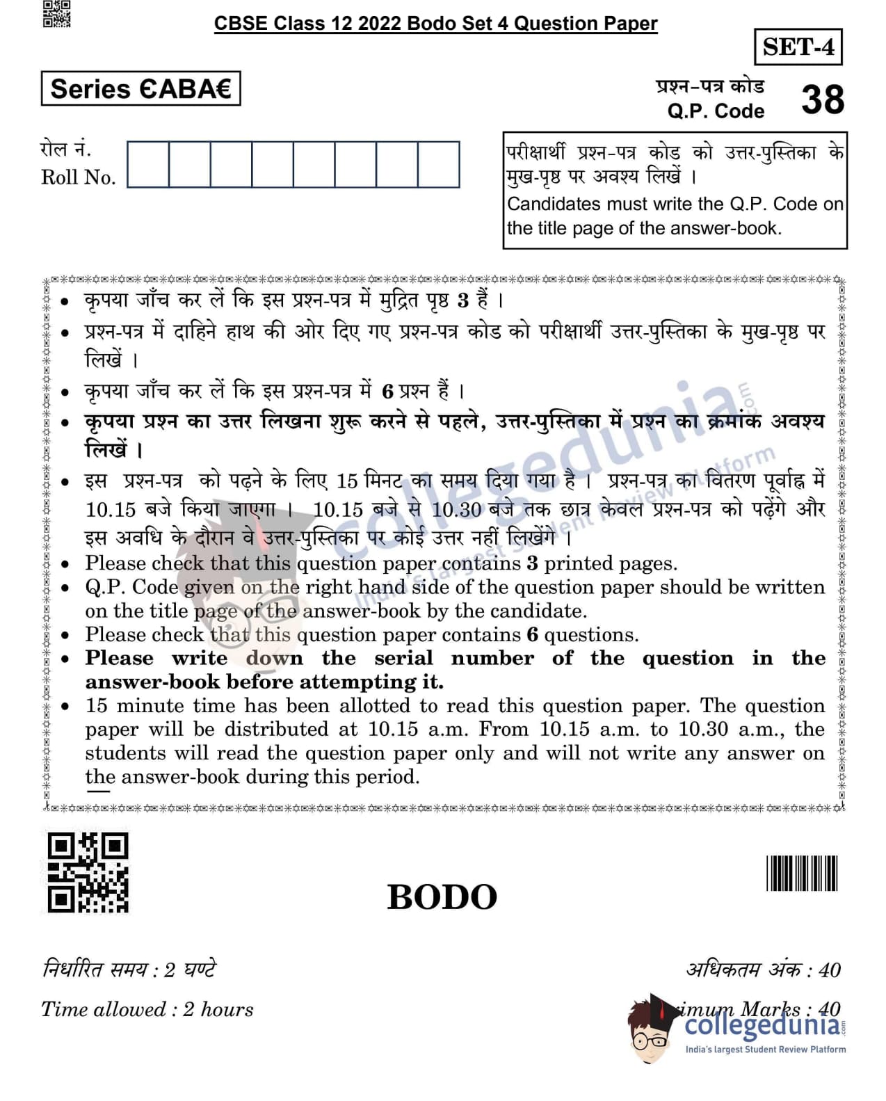 | CBSE Class 12 2022 Bodo Question Paper PDF | CBSE Class 12 2022 Bodo Answer Key PDF |