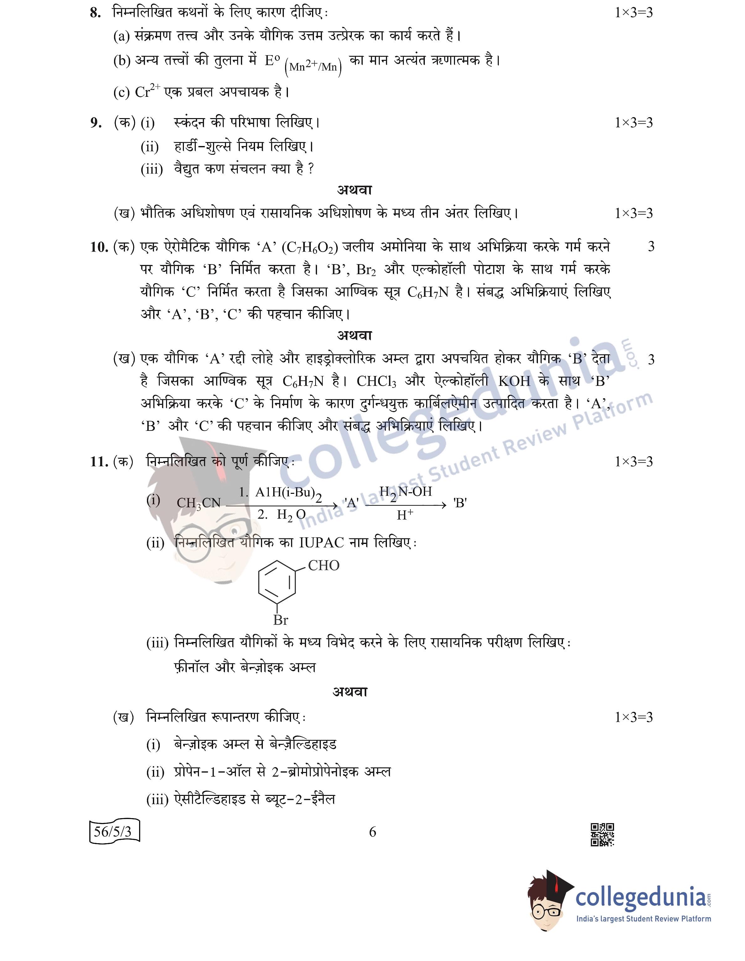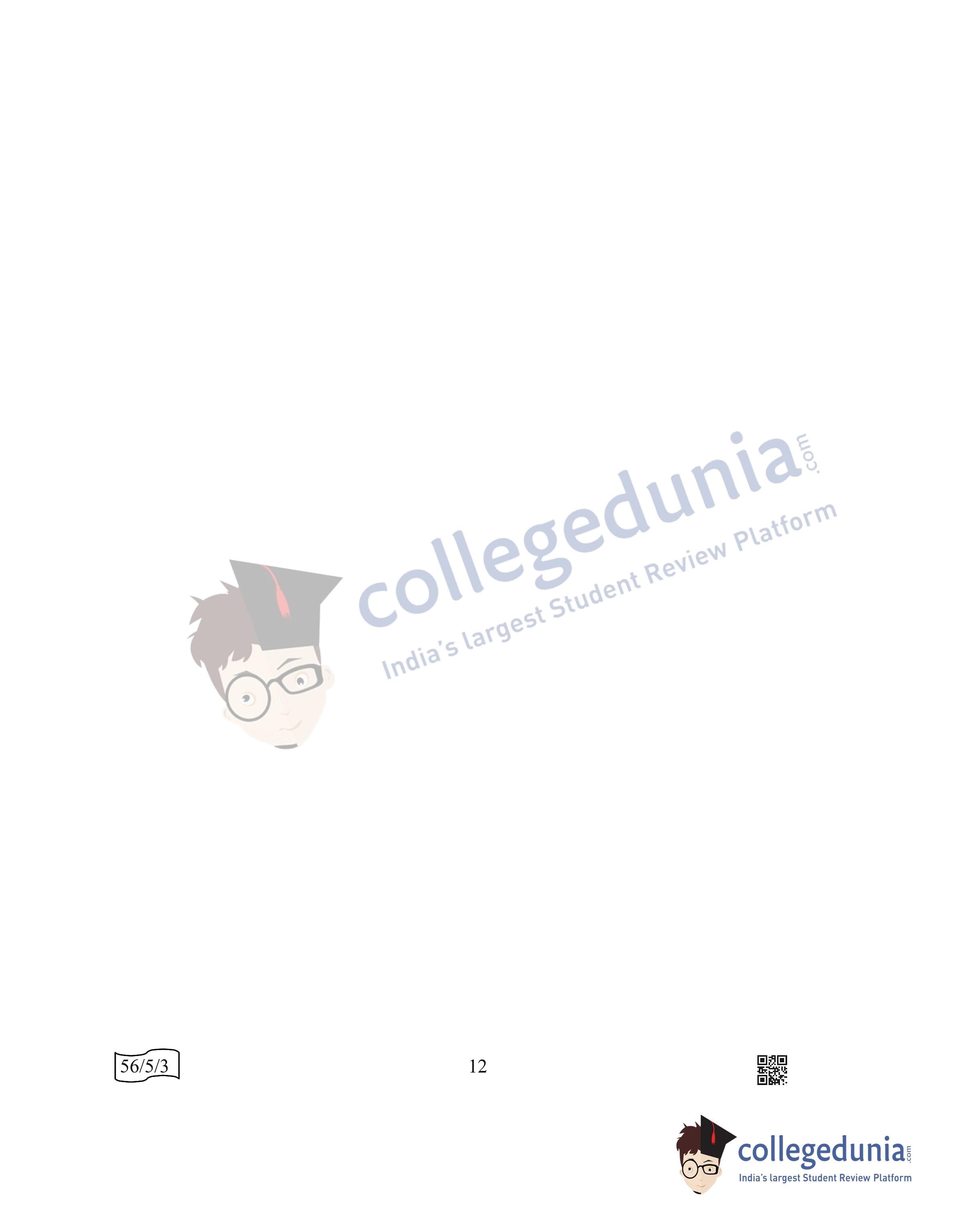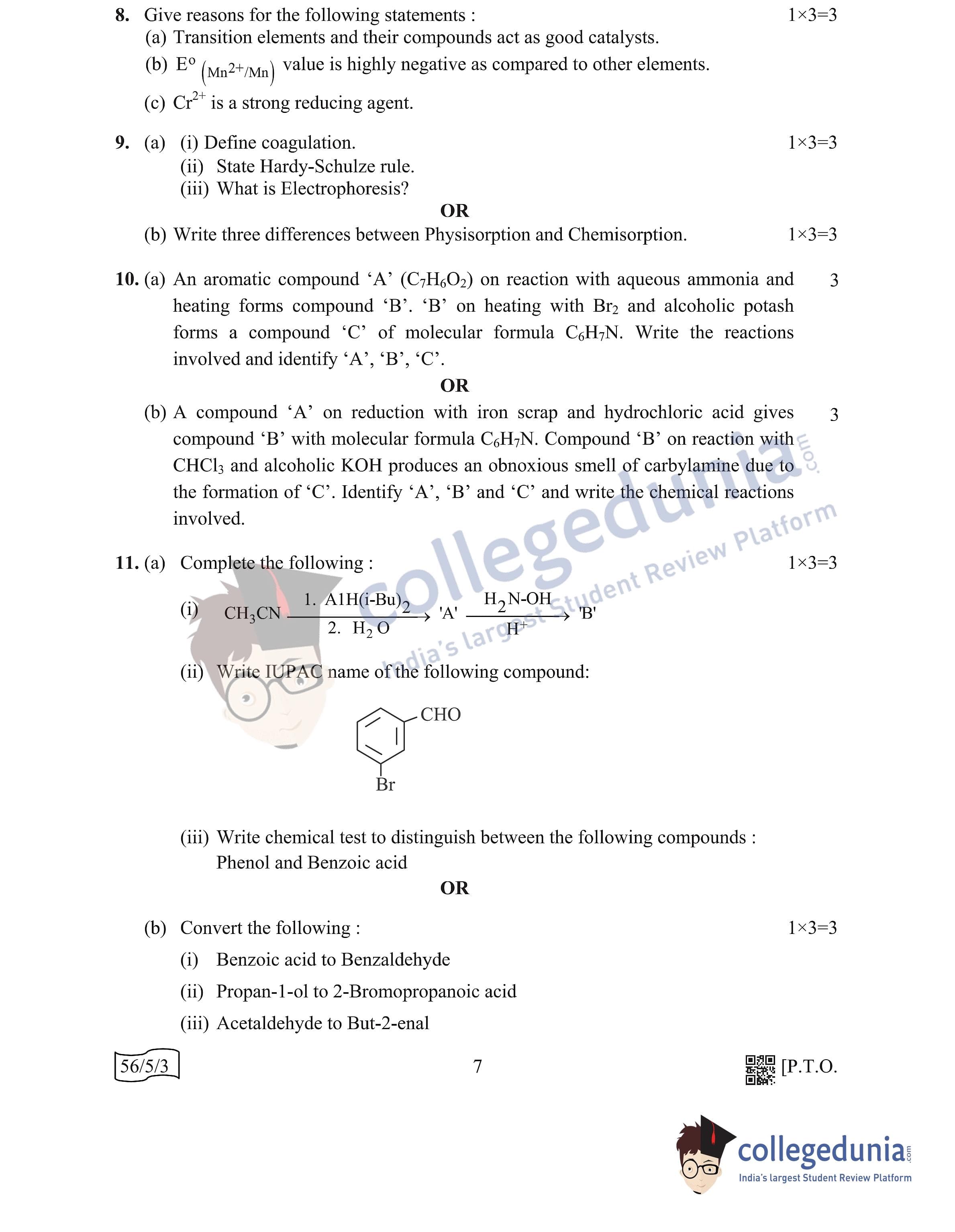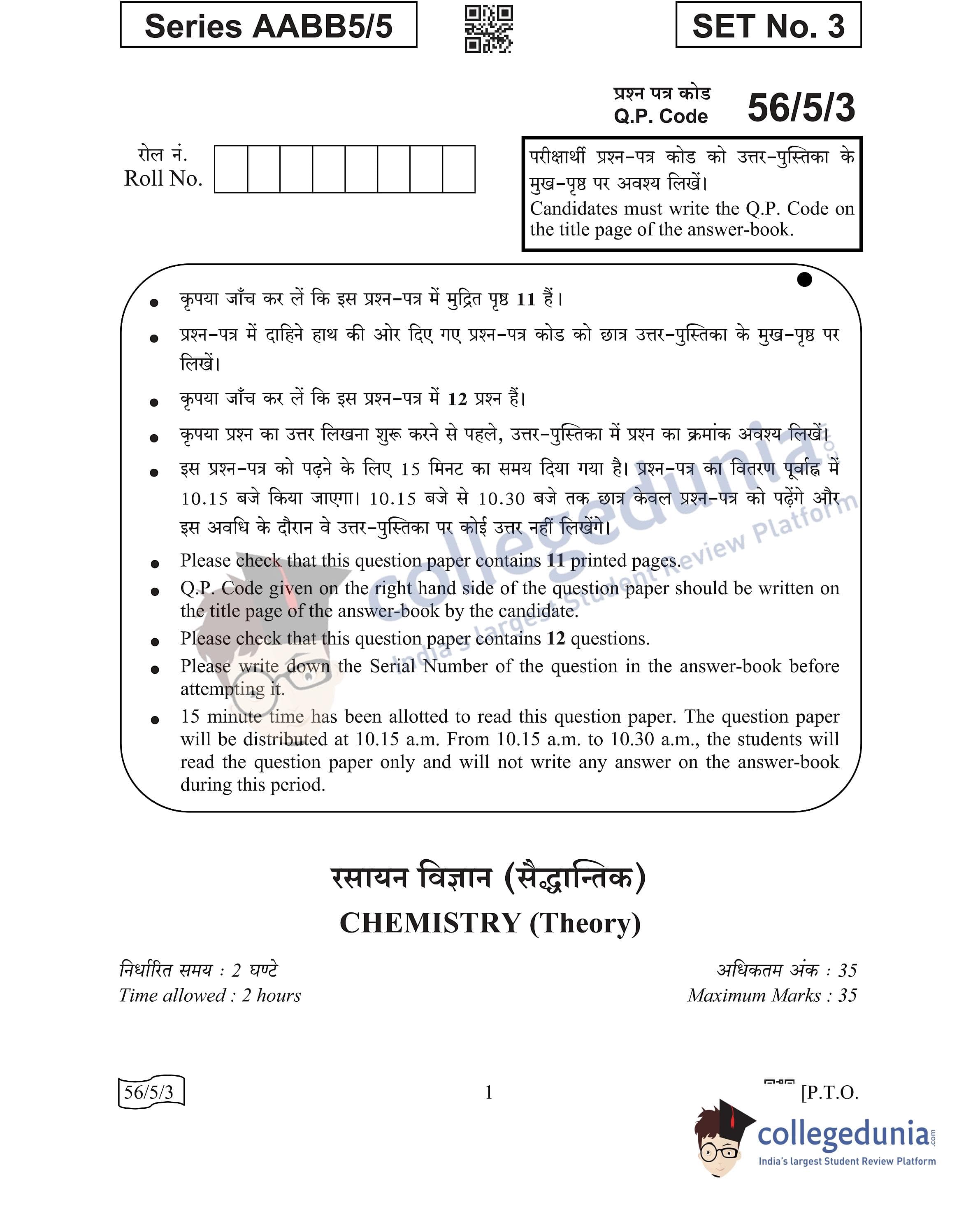 CBSE Class 12 Chemistry Question Paper 2022 with Answer Key (May 7, Set 3 - 56/5/3- Morning Session)