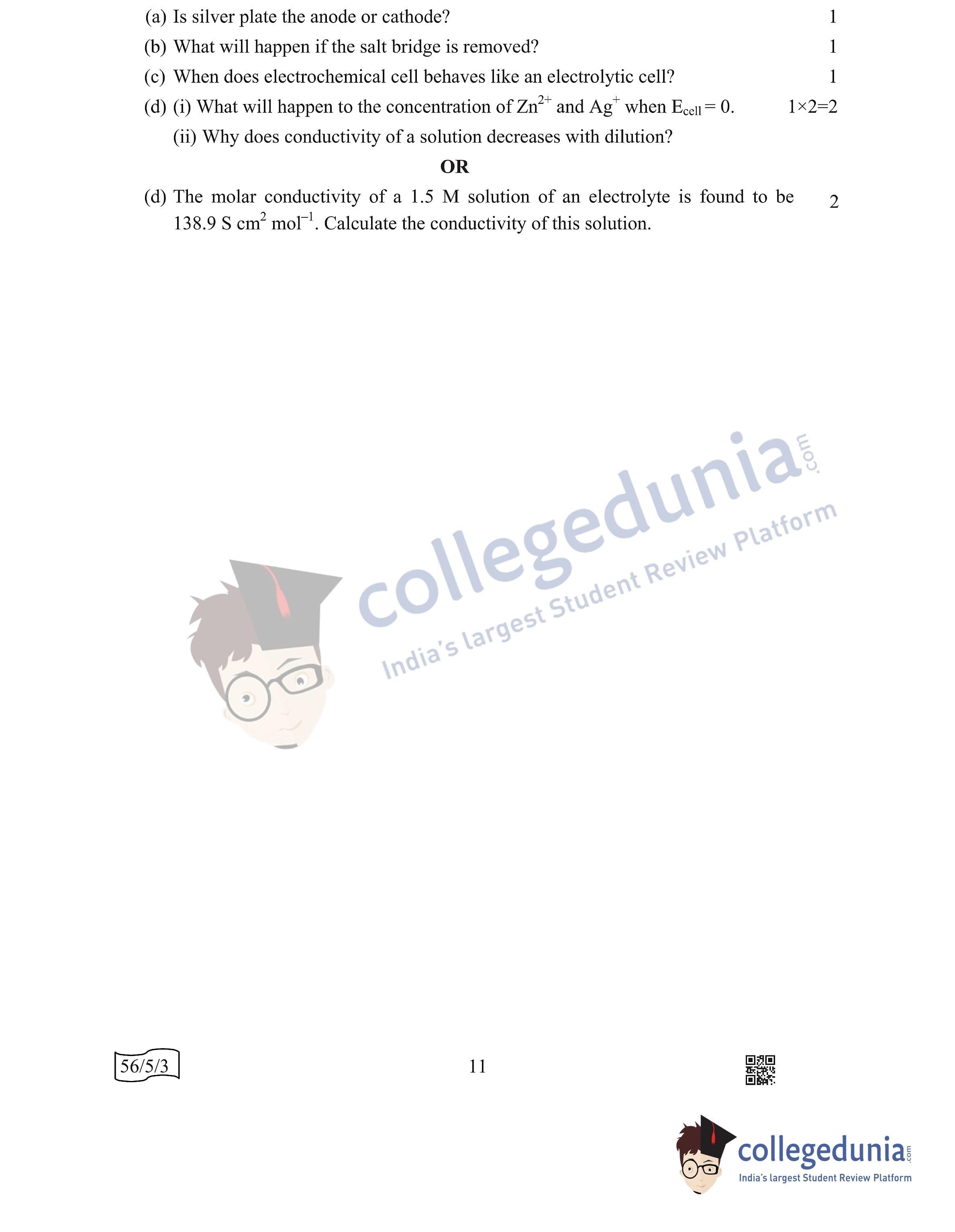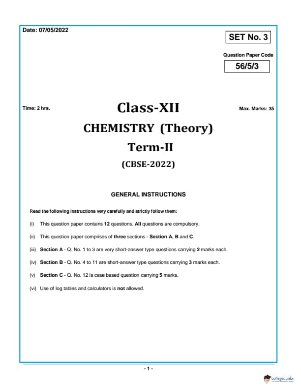 CBSE Class 12 2022 Chemistry Question Paper Set 3 - 56/5/3 with Answer Key pdf is available for download. The exam was conducted by Central Board of Secondary Education on May 7, 2022 in the Morning Session 10:30 AM to 12:30 PM. The medium of paper was English & Hindi. In terms of difficulty level, CBSE Class 12 Chemistry paper was of Moderate level. The question paper comprised a total of 12 questions divided among 3 sections.