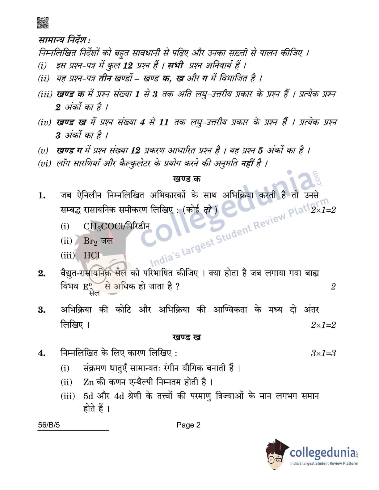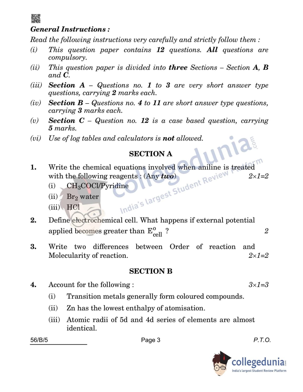 CBSE Class 12 2022 Chemistry(Visually Impaired) Question Paper Set 5 - 56/B/5 with Answer Key pdf is available for download. The exam was conducted by Central Board of Secondary Education on May 7, 2022 in the Morning Session 10:30 AM to 12:30 PM. The medium of paper was English & Hindi. In terms of difficulty level, CBSE Class 12 Chemistry(Visually Impaired) paper was of Moderate level. The question paper comprised a total of 12 questions divided among 3 sections.