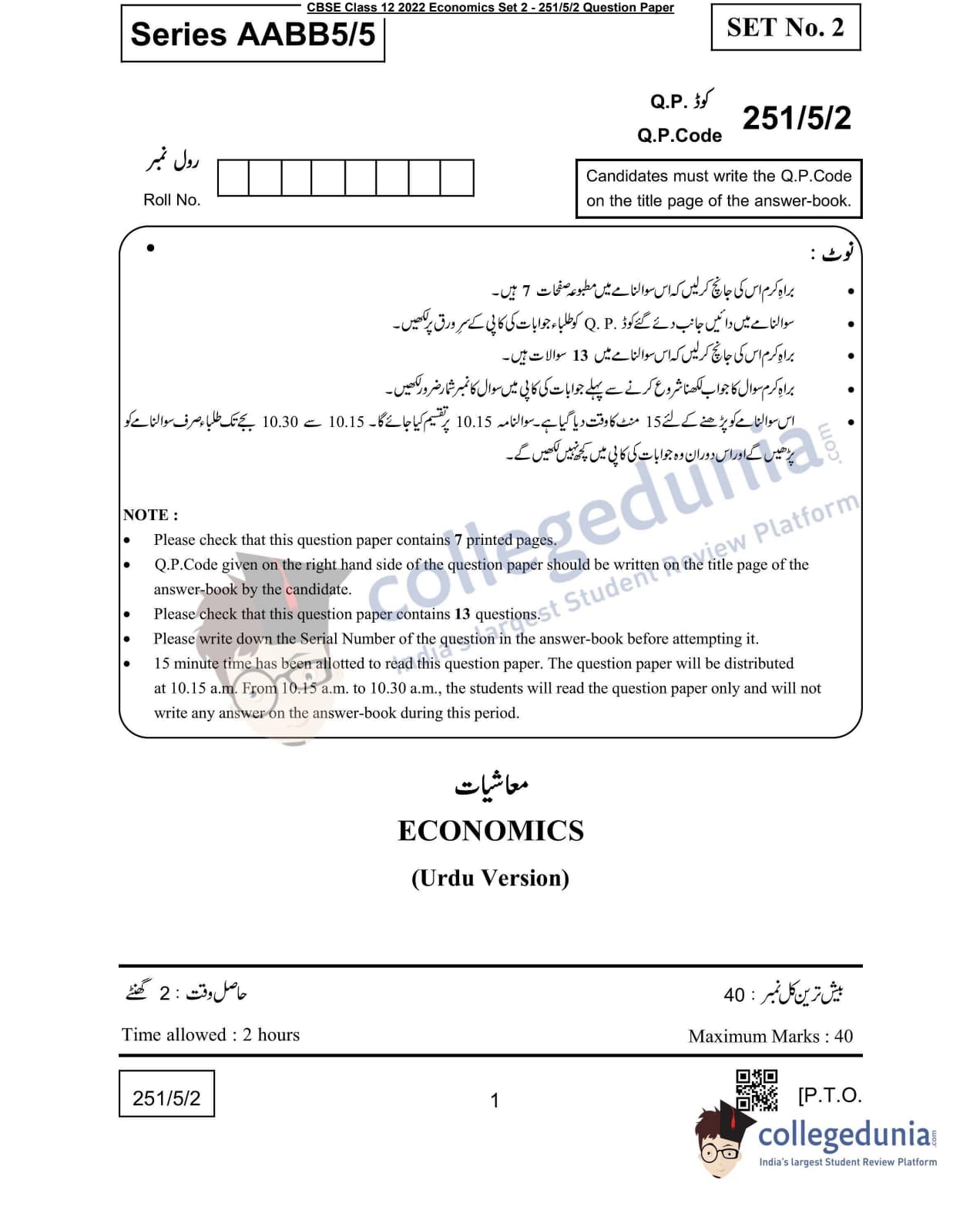 CBSE Class 12 2022 Economics Question Paper Set 2 - 251/5/2 with Answer Key pdf is available for download. The exam was conducted by Central Board of Secondary Education on May 28, 2022 in the Morning Session 10:30 AM to 12:30 PM. The medium of paper was Urdu. In terms of difficulty level, CBSE Class 12 Economics paper was of Moderate level. The question paper comprised a total of 13 questions.