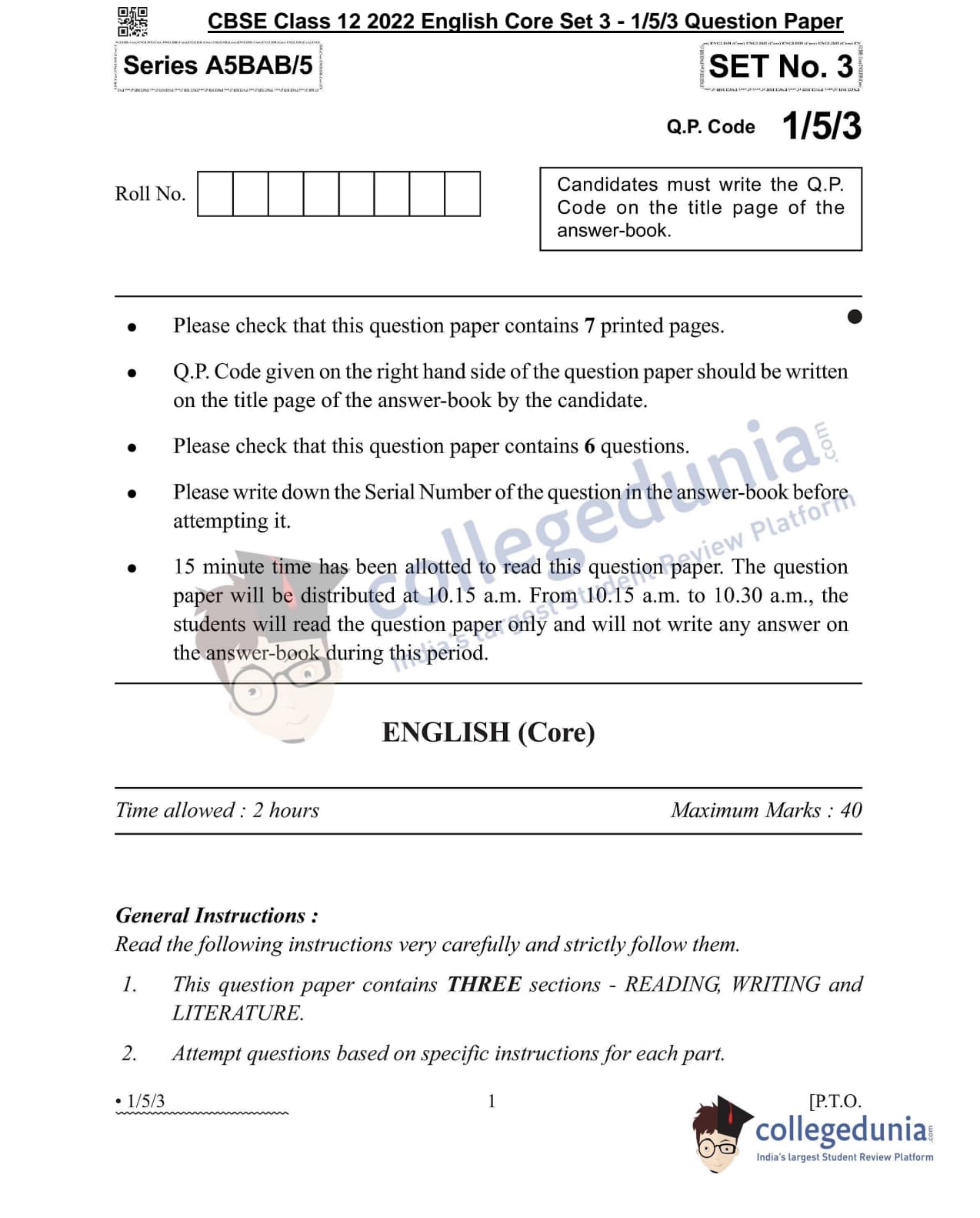 CBSE Class 12 2022 English Core Question Paper Set 3 - 1/5/3 with Answer Key pdf is available for download. The exam was conducted by Central Board of Secondary Education on May 13, 2022 in the Morning Session 10:30 AM to 12:30 PM. The medium of paper was English. In terms of difficulty level, CBSE Class 12 English Core paper was of Moderate level. The question paper comprised a total of 6 questions divided among 3 sections.