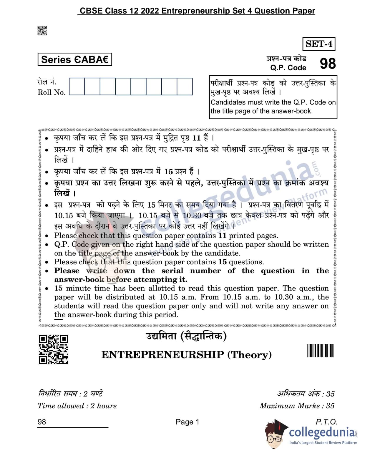 | CBSE Class 12 2022 Entrepreneurship Question Paper PDF | CBSE Class 12 2022 Entrepreneurship Answer Key PDF |