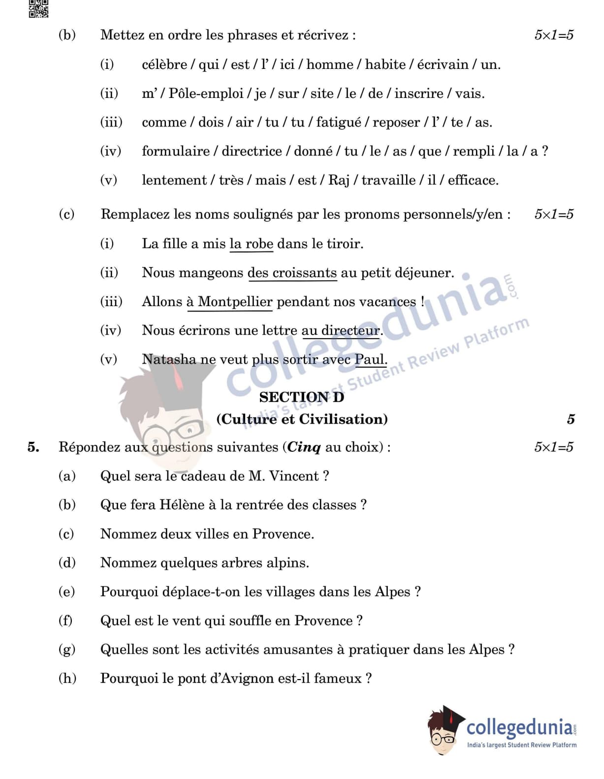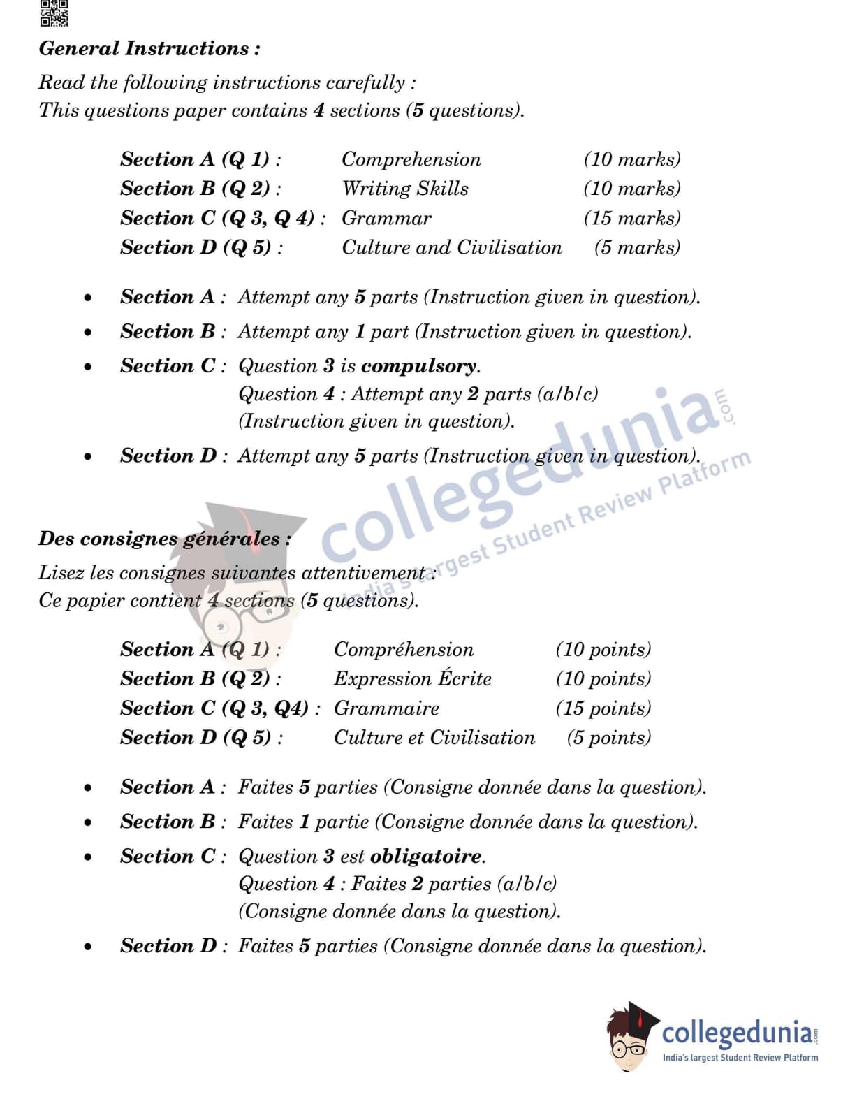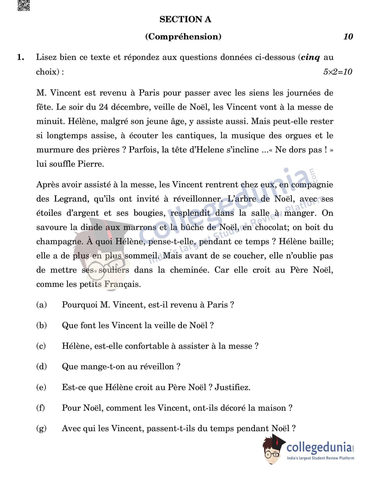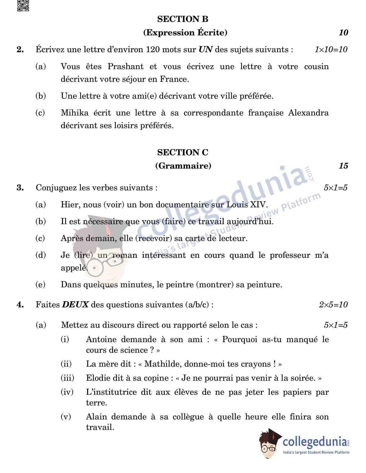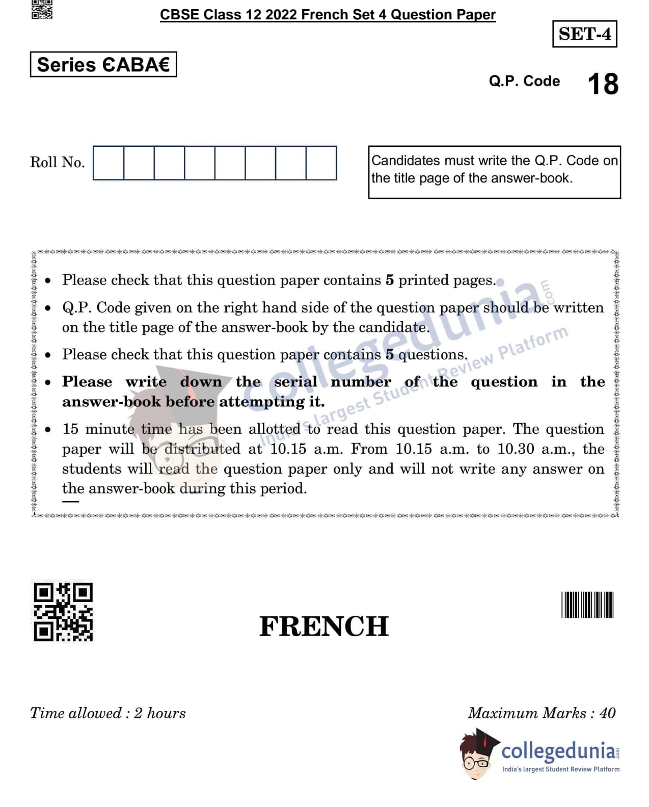 CBSE Class 12 French Question Paper 2022 with Answer Key (May 11, Set 4- Morning Session)