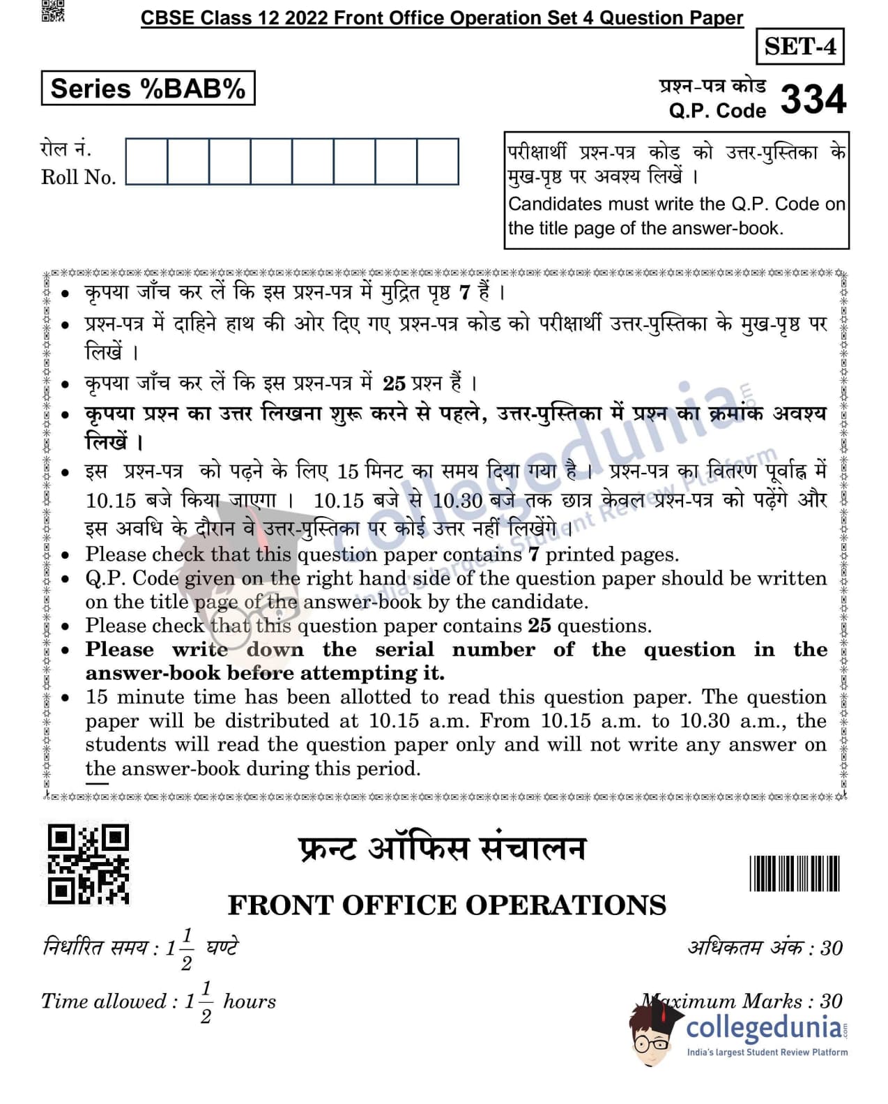 CBSE Class 12 2022 Front Office Operation Question Paper Set 4 with Answer Key pdf is available for download. The exam was conducted by Central Board of Secondary Education on May 31, 2022 in the Morning Session 10:30 AM to 12:00 PM. The medium of paper was English & Hindi. The question paper comprised a total of 25 questions divided among 3 sections.