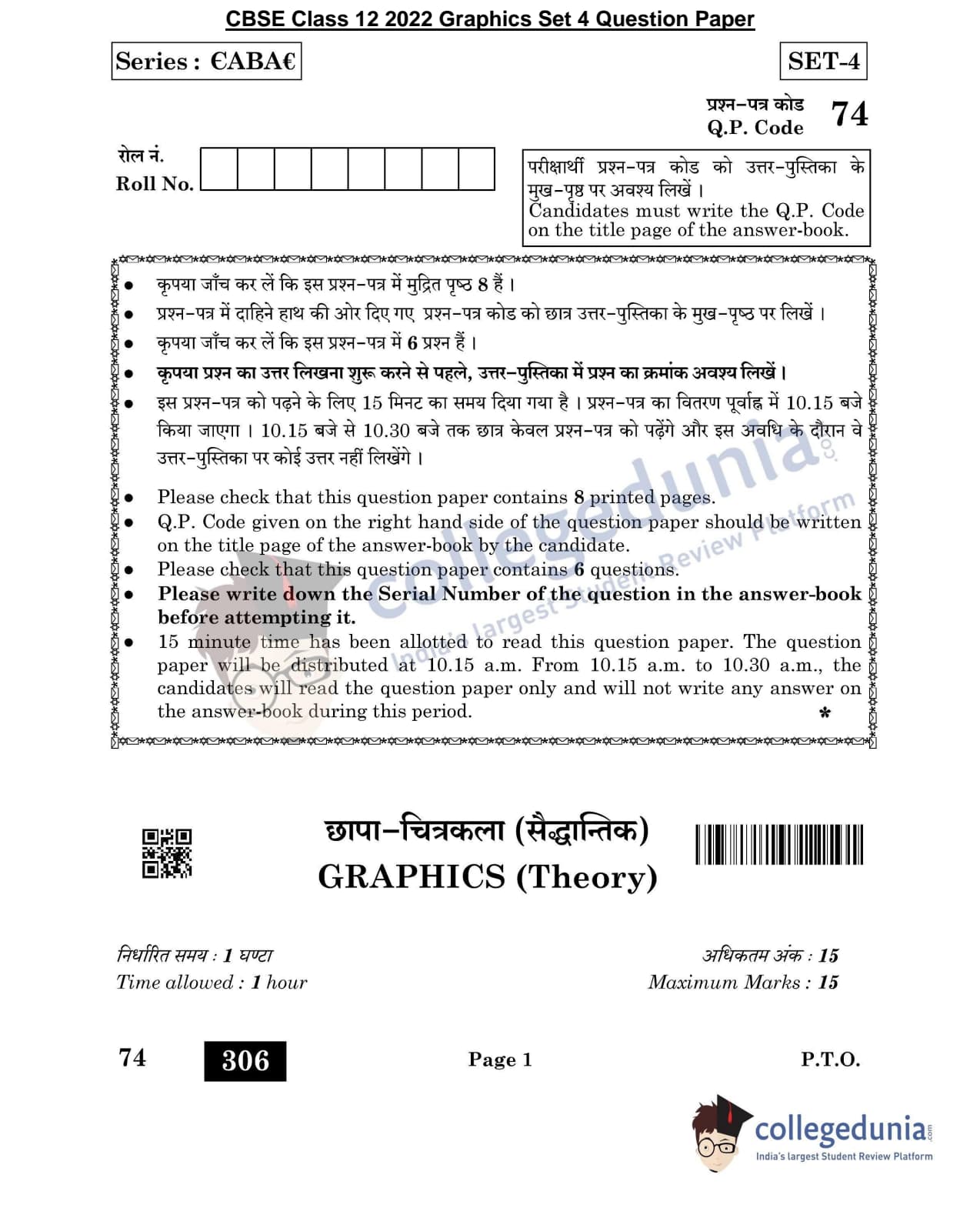 CBSE Class 12 2022 Graphics Question Paper Set 4 with Answer Key pdf is available for download. The exam was conducted by Central Board of Secondary Education on June 6, 2022 in the Morning Session 10:30 AM to 11:30 PM. The medium of paper was English & Hindi. The question paper comprised a total of 6 questions.