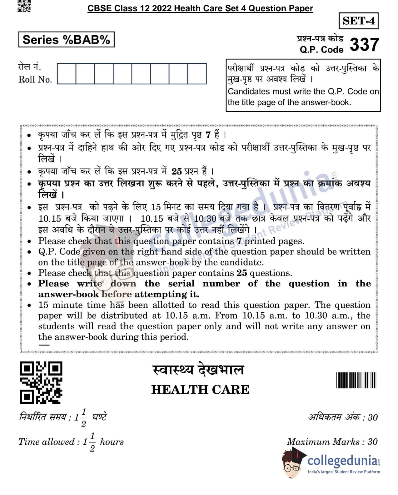 CBSE Class 12 2022 Health Care Question Paper Set 4 with Answer Key pdf is available for download. The exam was conducted by Central Board of Secondary Education on May 26, 2022 in the Morning Session 10:30 AM to 12:00 PM. The medium of paper was English & Hindi. The question paper comprised a total of 25 questions divided among 3 sections.