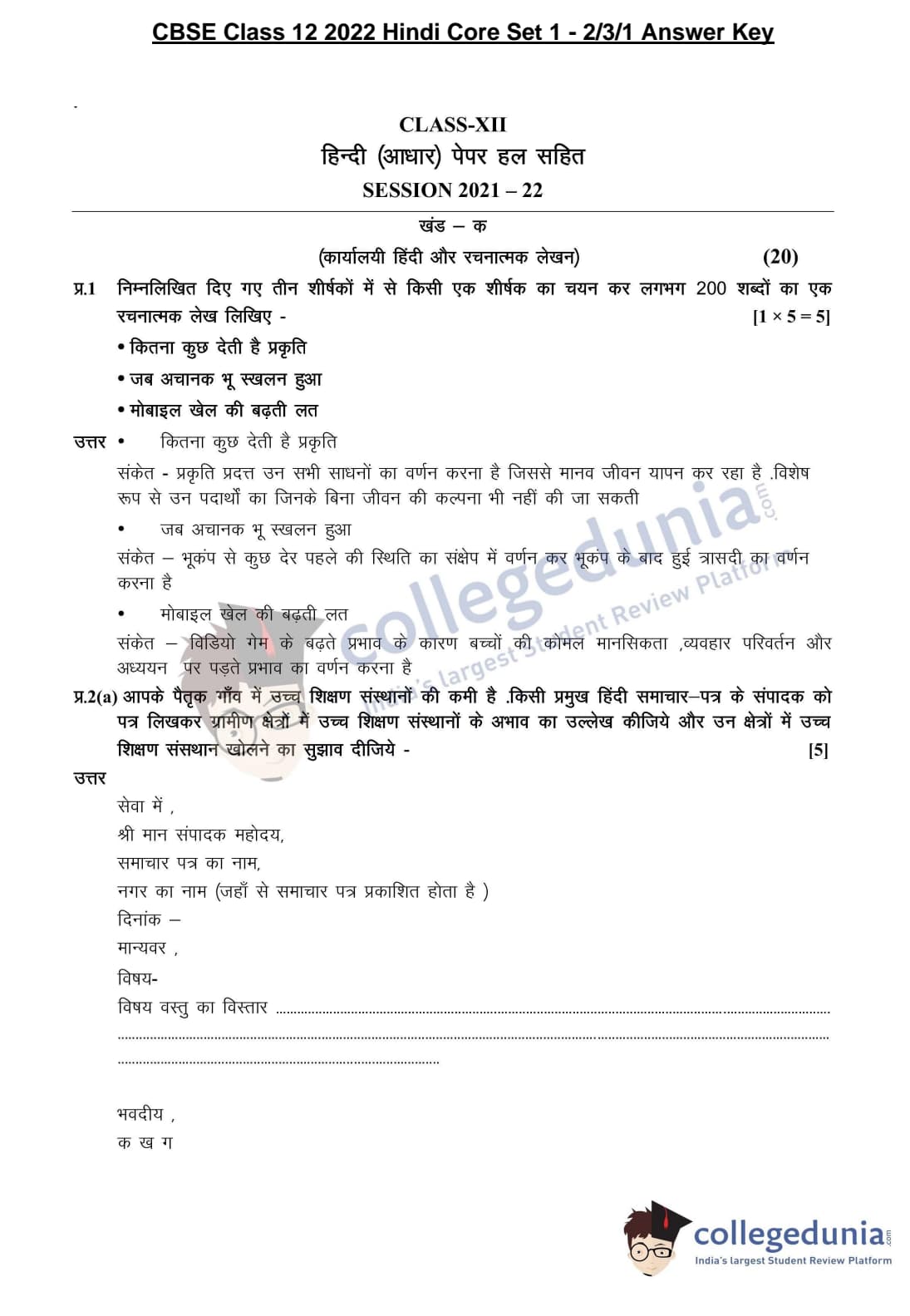 CBSE Class 12 Hindi Core Question Paper 2022 with Answer Key (May 2, Set 1 - 2/3/1- Morning Session)