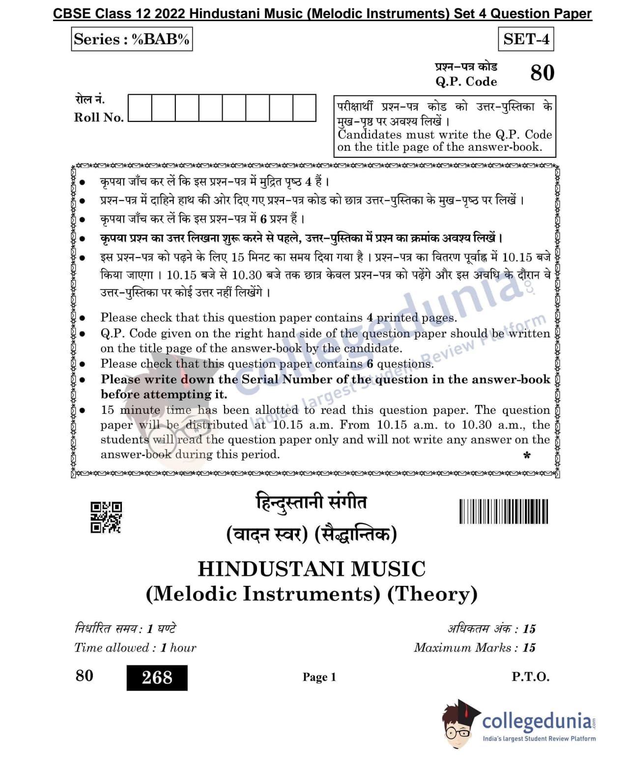 CBSE Class 12 Hindustani Music Mel Ins Question Paper 2022 with Answer Key (May 26, Set 4- Morning Session)