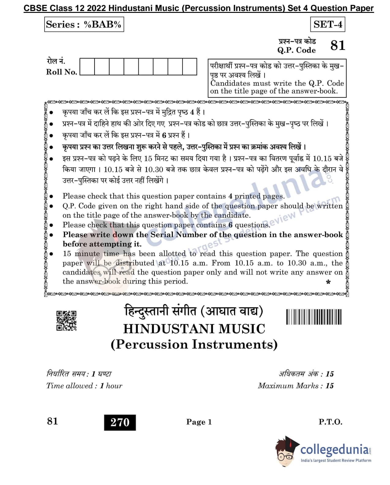 CBSE Class 12 2022 Hindustani Music (Percussion Instruments) Question Paper Set 4 with Answer Key pdf is available for download. The exam was conducted by Central Board of Secondary Education on May 26, 2022 in the Morning Session 10:30 AM to 11:30 PM. The medium of paper was English & Hindi. In terms of difficulty level, CBSE Class 12 Hindustani Music Per Ins paper was of Moderate level. The question paper comprised a total of 6 questions.