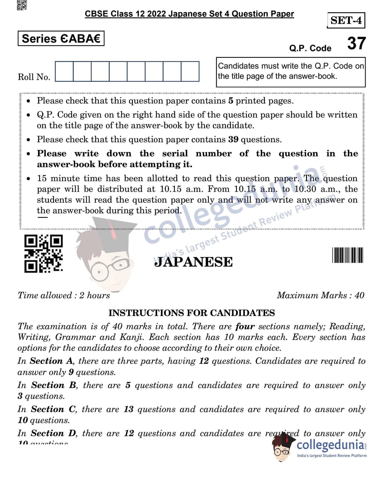 CBSE Class 12 2022 Japanese Question Paper Set 4 with Answer Key pdf is available for download. The exam was conducted by Central Board of Secondary Education on May 11, 2022 in the Morning Session 10:30 AM to 12:30 PM. The medium of paper was Japanese. The question paper comprised a total of 39 questions divided among 4 sections.