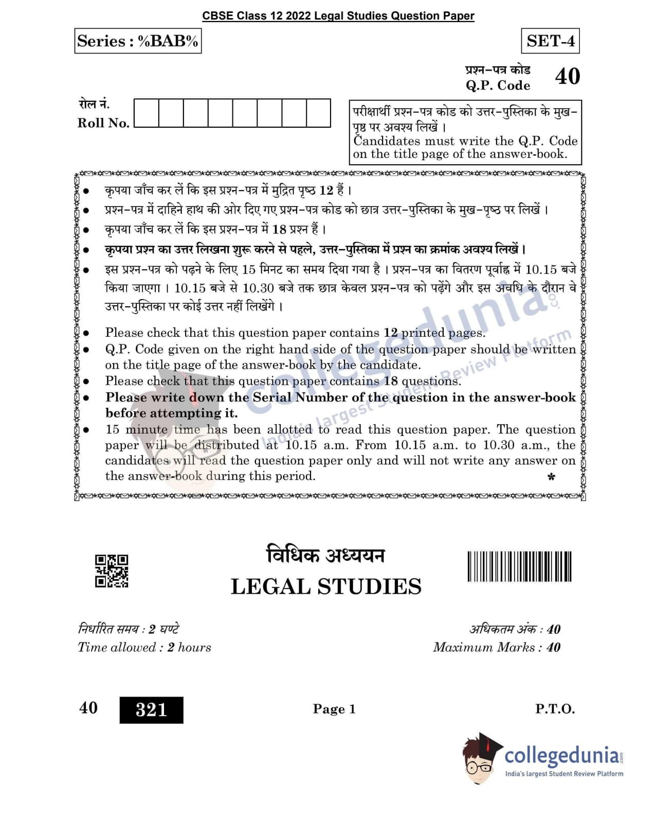 CBSE Class 12 2022 Legal Studies Question Paper Set 4 with Answer Key pdf is available for download. The exam was conducted by Central Board of Secondary Education on June 14, 2022 in the Morning Session 10:30 AM to 12:30 PM. The medium of paper was English & Hindi. The question paper comprised a total of 18 questions divided among 3 sections.