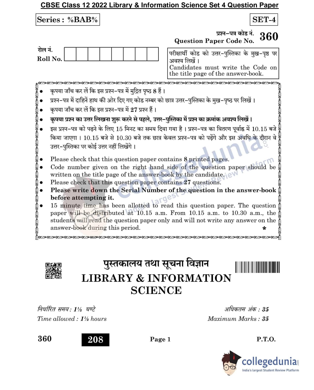 | CBSE Class 12 2022 Library & Information Science Question Paper PDF | CBSE Class 12 2022 Library & Information Science Answer Key PDF |