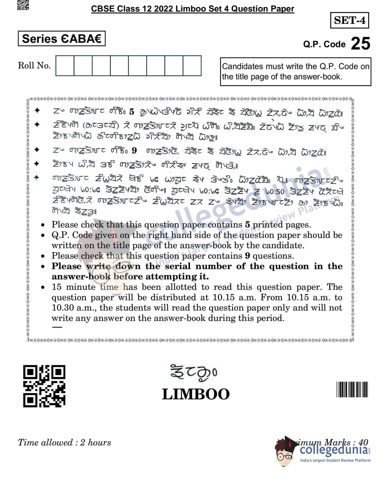 CBSE Class 12 Limboo Question Paper 2022 with Answer Key (May 11, Set 4- Morning Session)