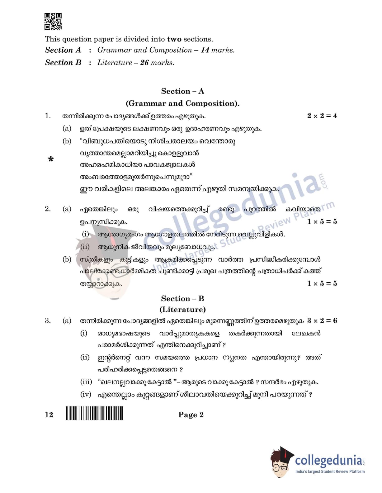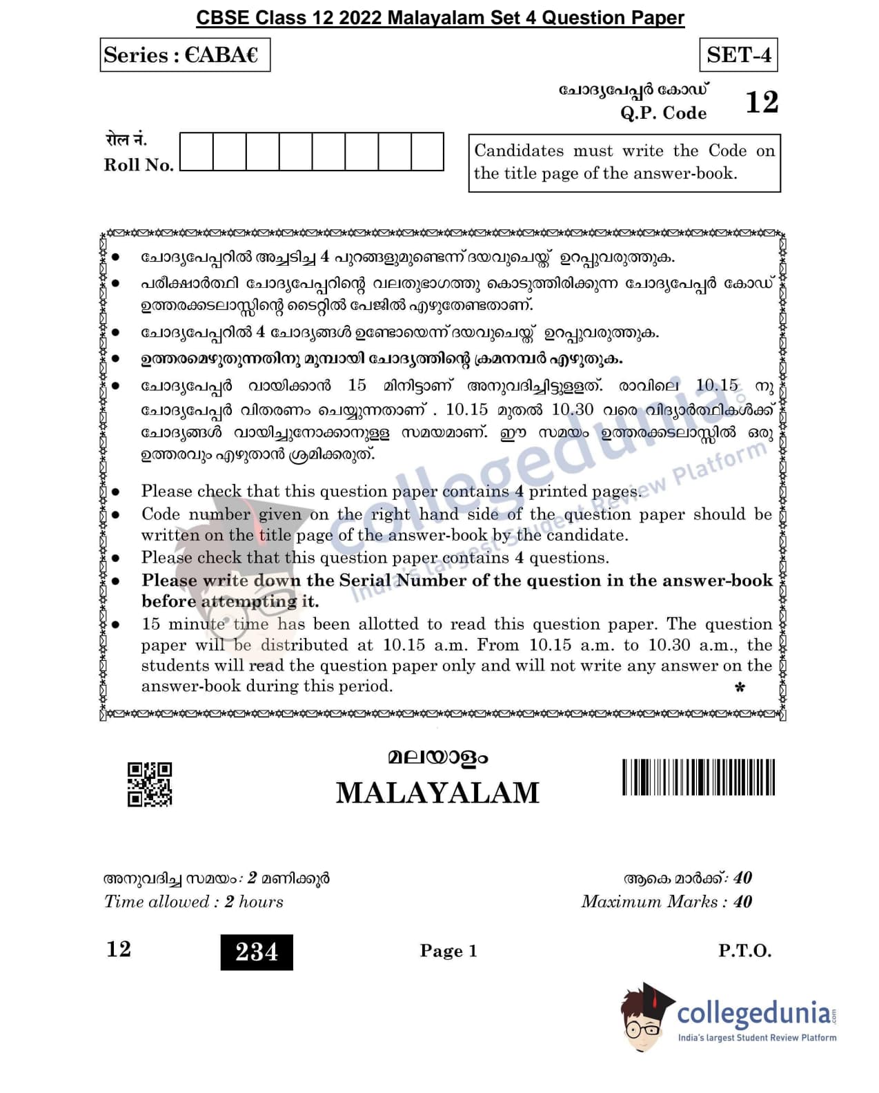 CBSE Class 12 Malayalam Question Paper 2022 with Answer Key (May 11, Set 4- Morning Session)