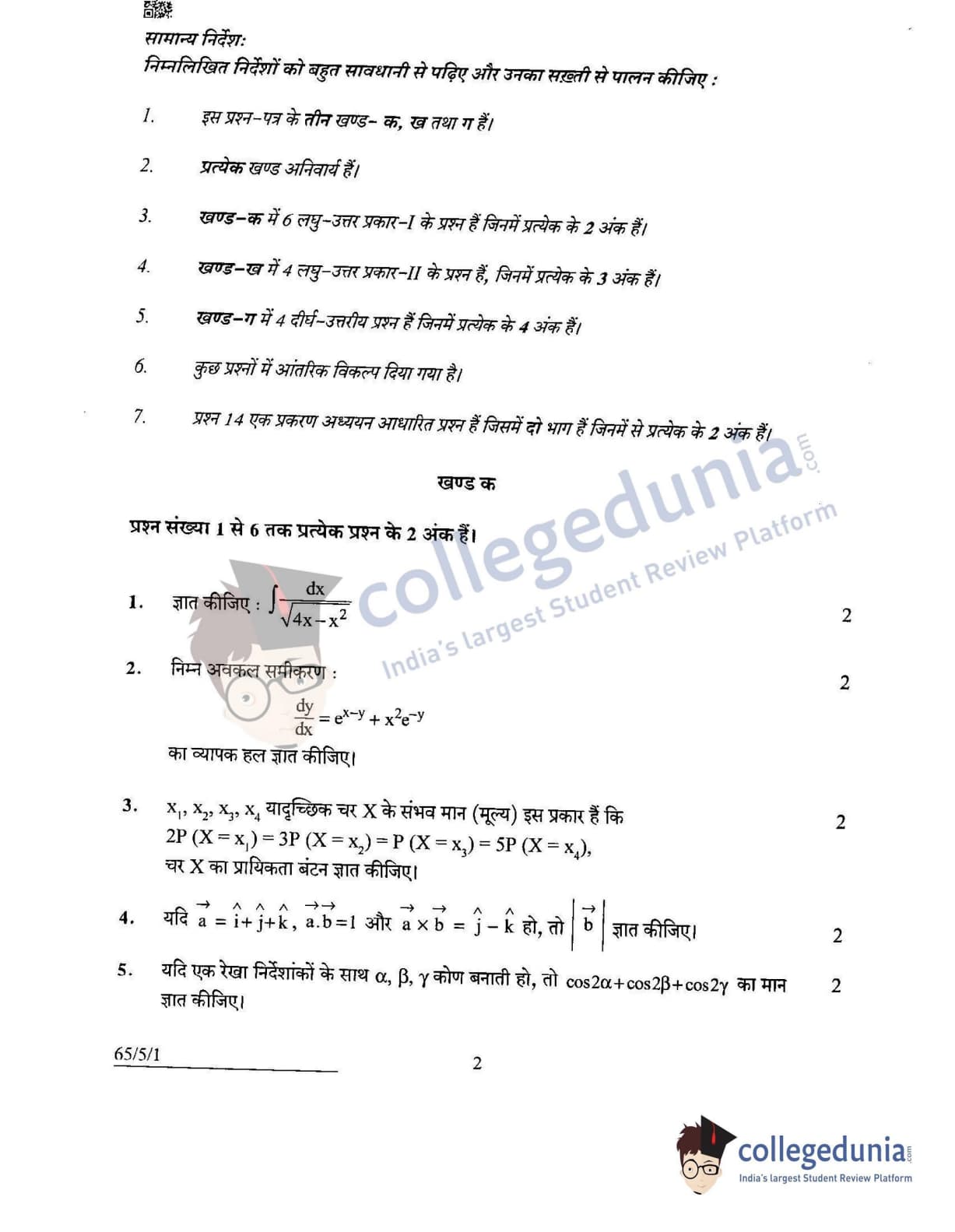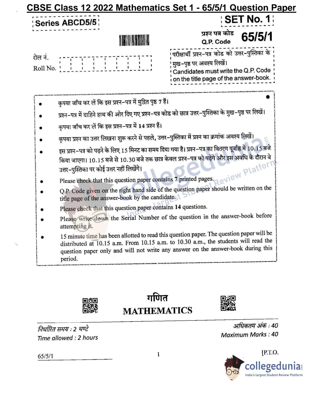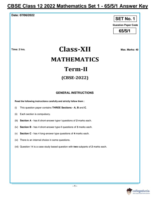 CBSE Class 12 2022 Mathematics Question Paper Set 1 - 65/5/1 with Answer Key pdf is available for download. The exam was conducted by Central Board of Secondary Education on June 7, 2022 in the Morning Session 10:30 AM to 12:30 PM. The medium of paper was English & Hindi. In terms of difficulty level, CBSE Class 12 Mathematics paper was of Moderate level. The question paper comprised a total of 14 questions divided among 3 sections.