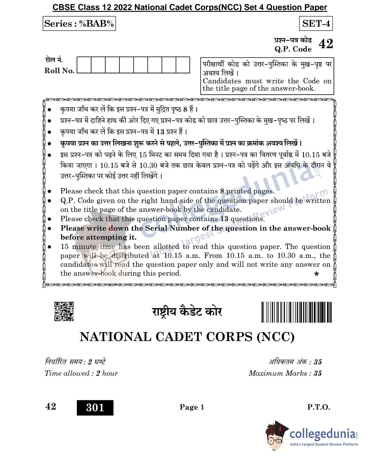CBSE Class 12 2022 NCC Question Paper Set 4 with Answer Key pdf is available for download. The exam was conducted by Central Board of Secondary Education on June 4, 2022 in the Morning Session 10:30 AM to 12:30 PM. The medium of paper was English & Hindi. The question paper comprised a total of 13 questions divided among 2 sections.