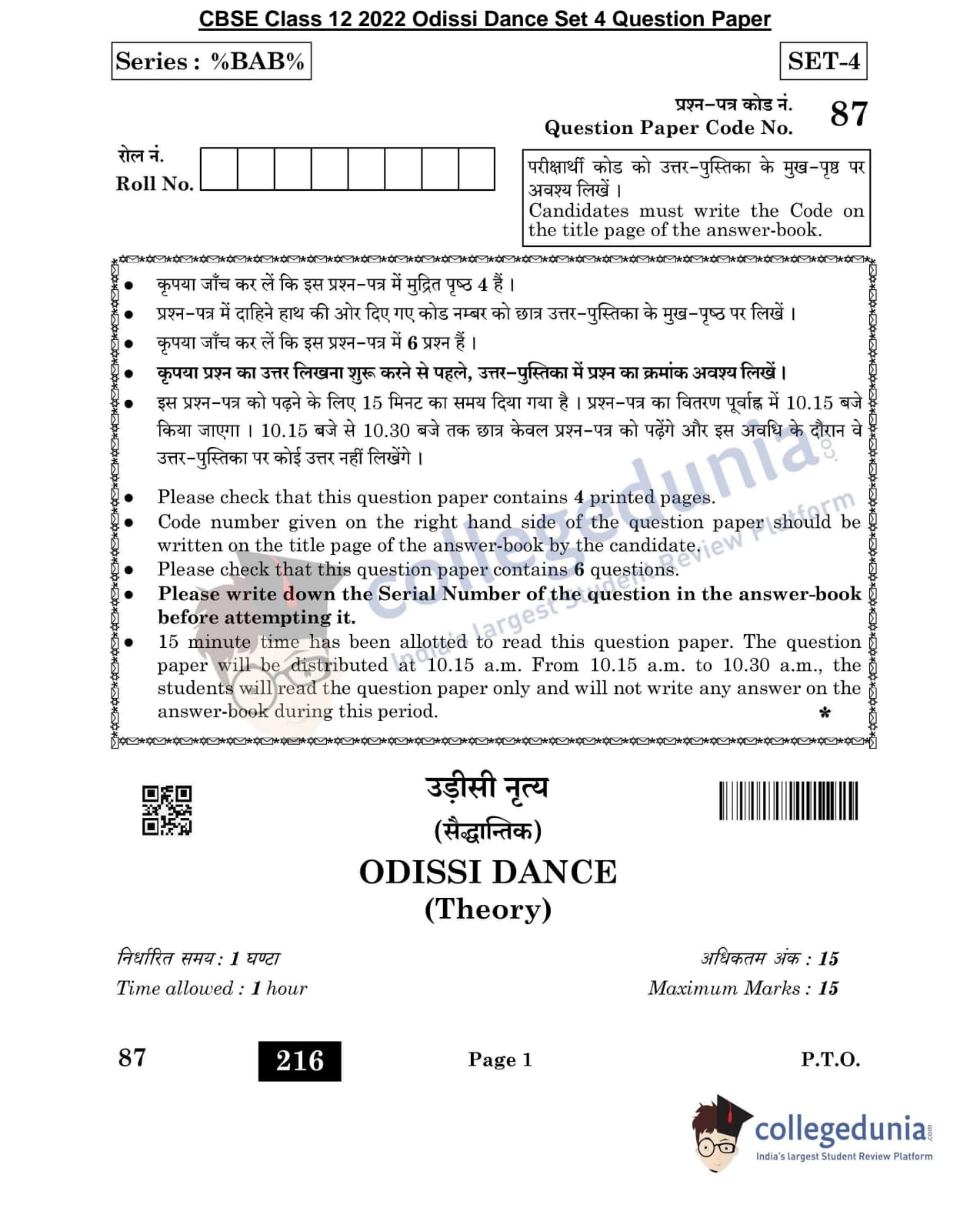 CBSE Class 12 Odissi Dance Question Paper 2022 with Answer Key (May 4, Set 4- Morning Session)