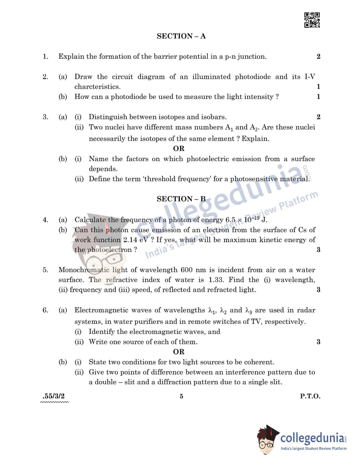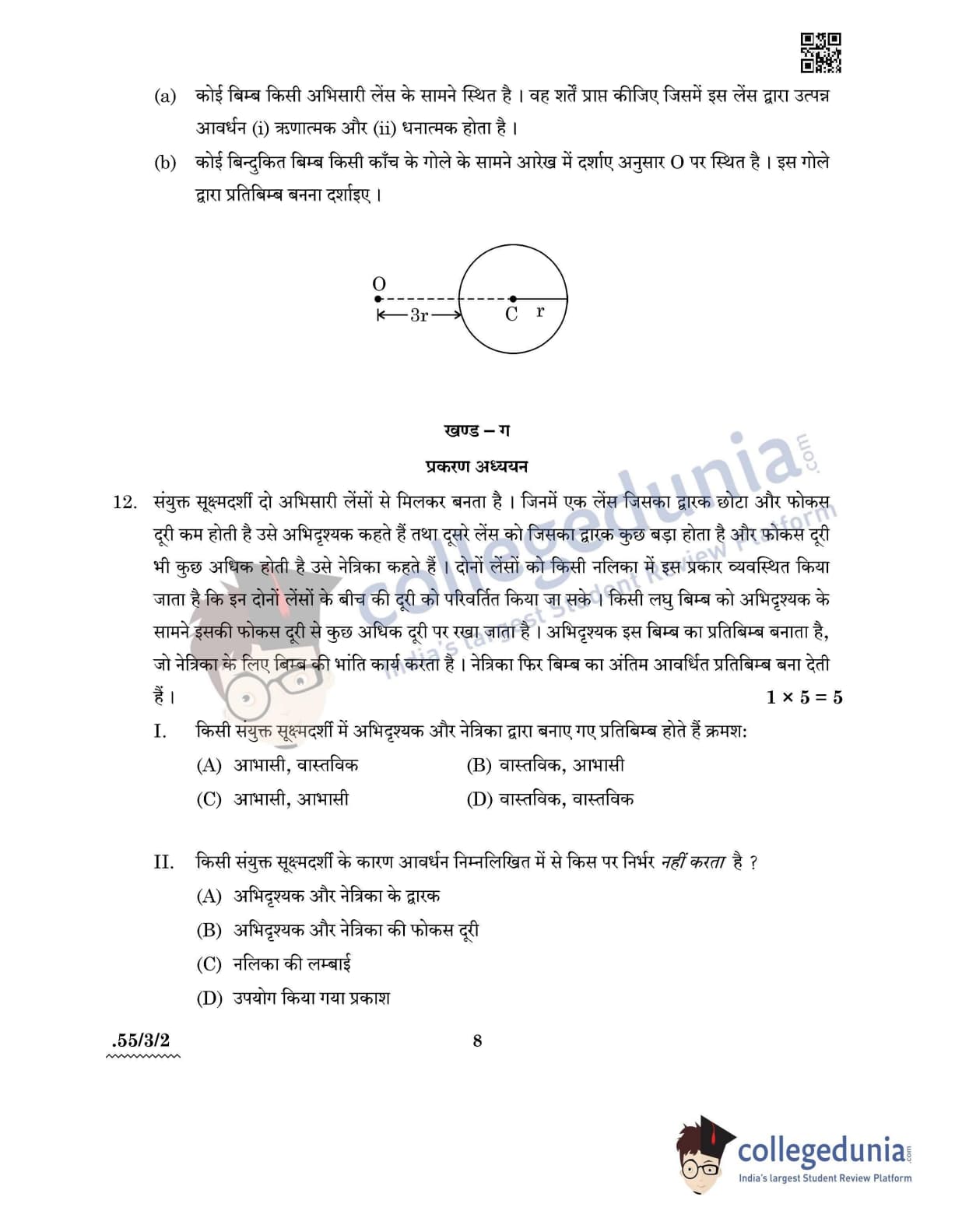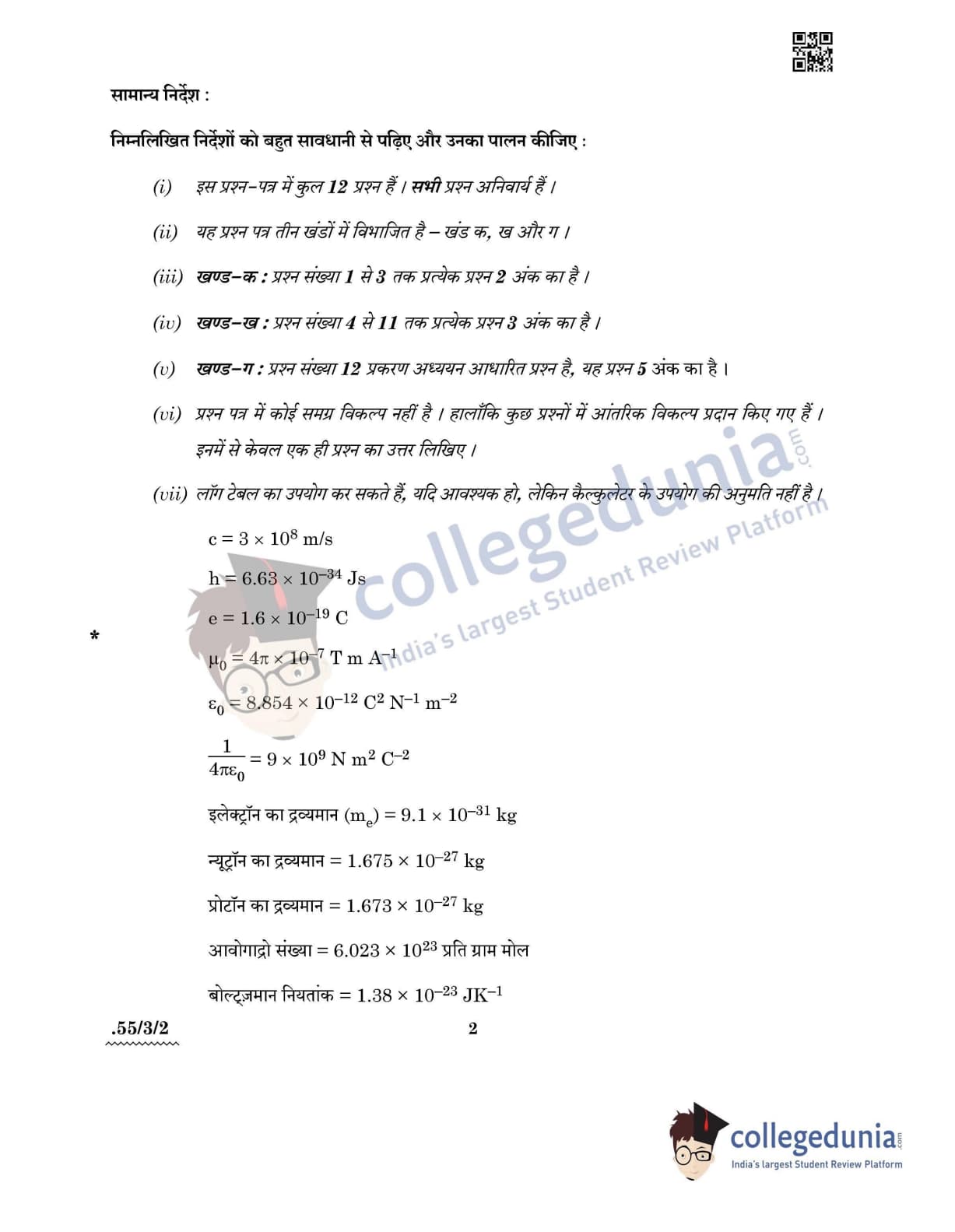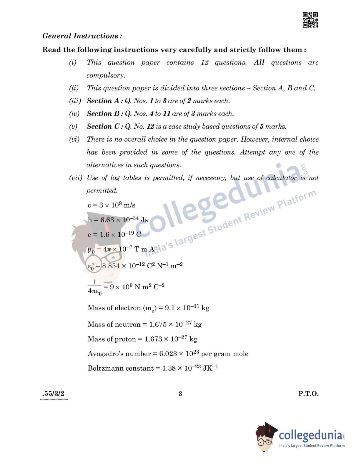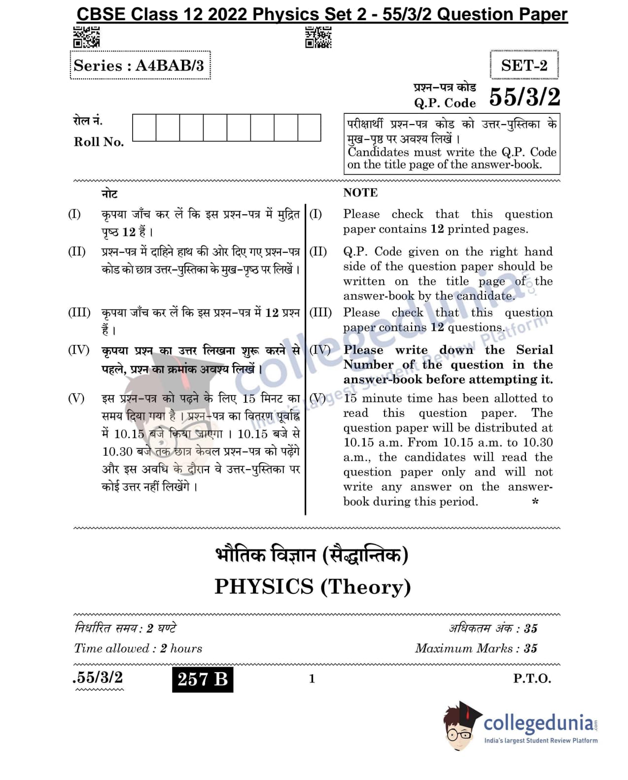 CBSE Class 12 2022 Physics Question Paper Set 2 - 55/3/2 with Answer Key pdf is available for download. The exam was conducted by Central Board of Secondary Education on May 20, 2022 in the Morning Session 10:30 AM to 12:30 PM. The medium of paper was English & Hindi. In terms of difficulty level, CBSE Class 12 Physics paper was of Moderate level. The question paper comprised a total of 12 questions divided among 3 sections.