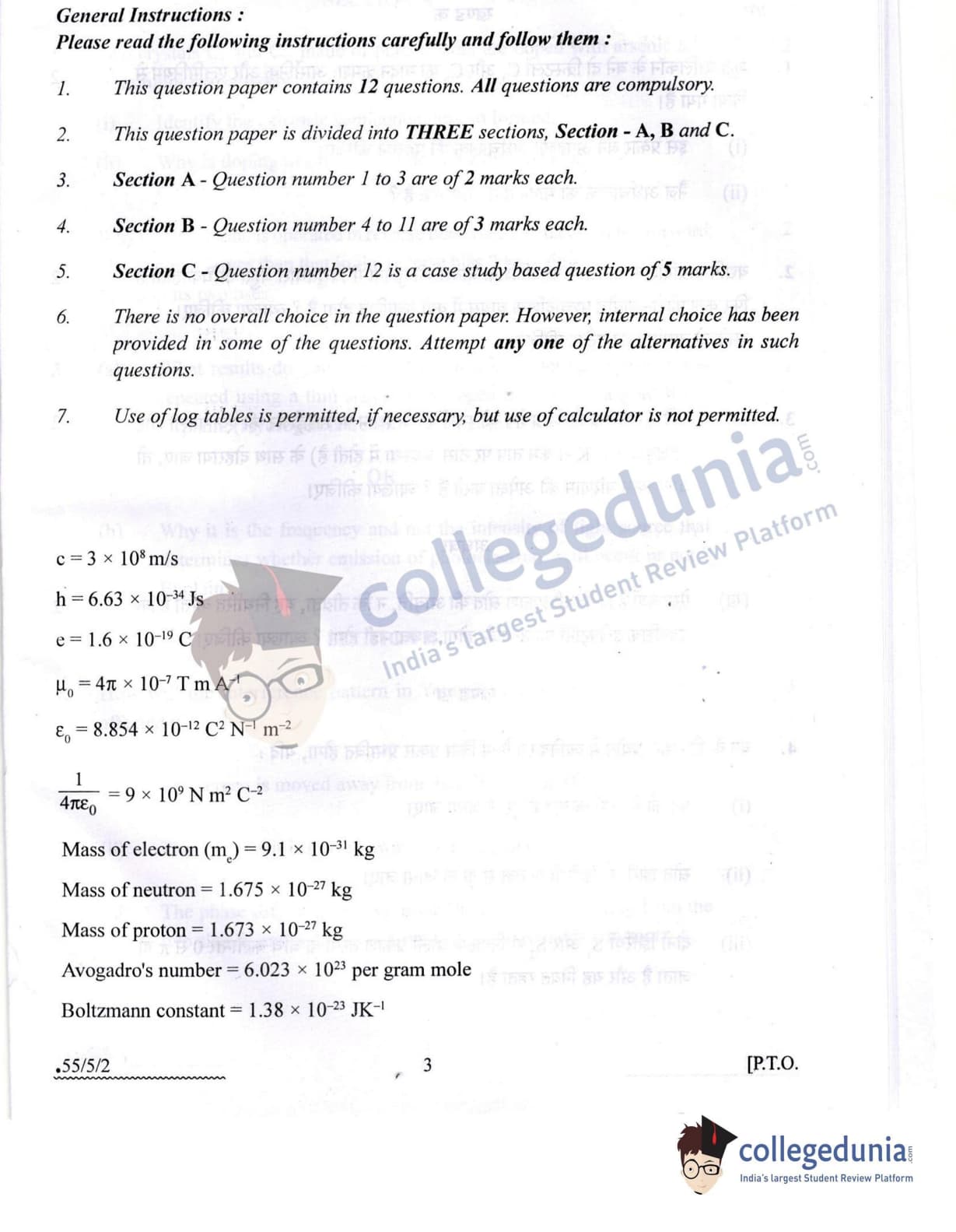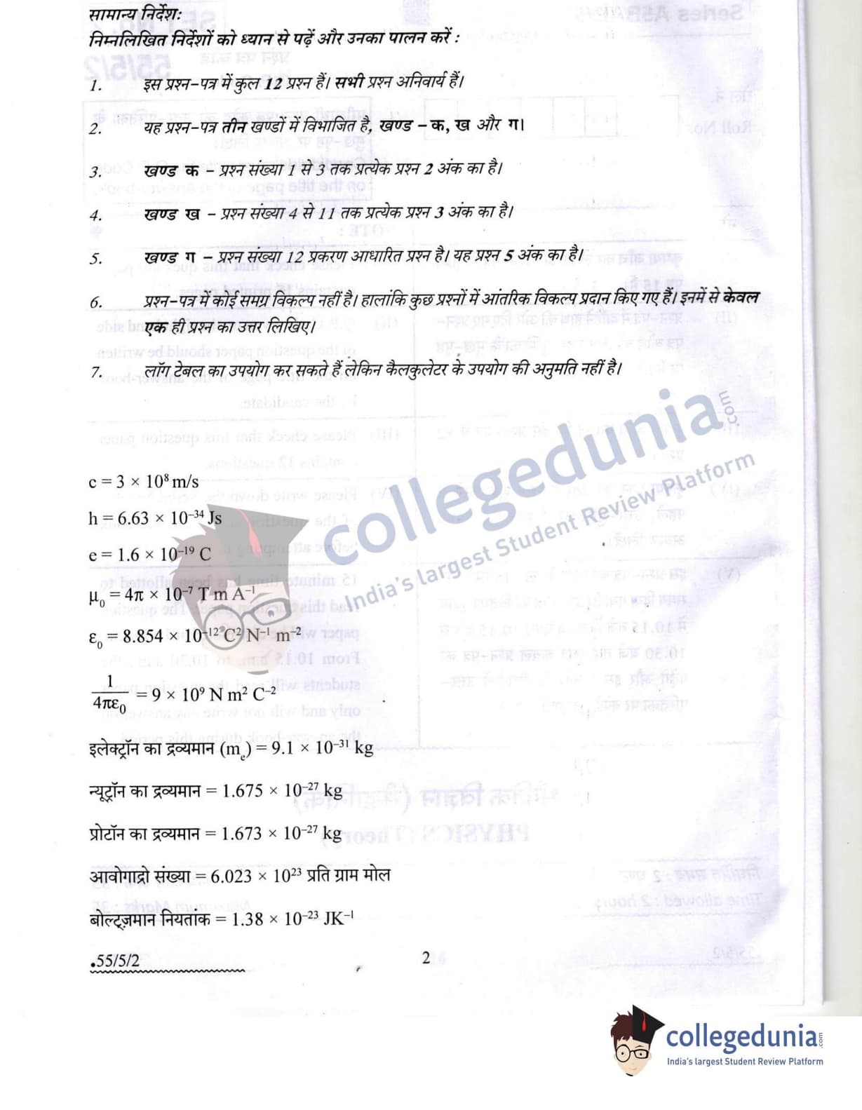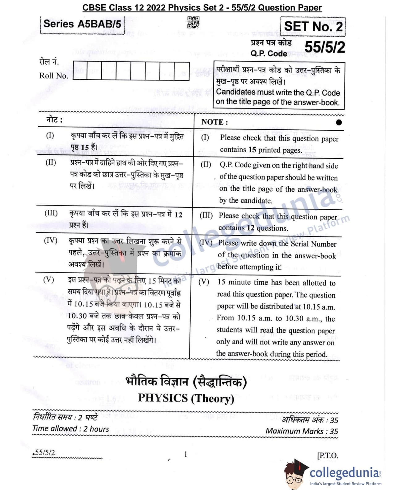 CBSE Class 12 2022 Physics Question Paper Set 2 - 55/5/2 with Answer Key pdf is available for download. The exam was conducted by Central Board of Secondary Education on May 20, 2022 in the Morning Session 10:30 AM to 12:30 PM. The medium of paper was English & Hindi. In terms of difficulty level, CBSE Class 12 Physics paper was of Moderate level. The question paper comprised a total of 12 questions divided among 3 sections.