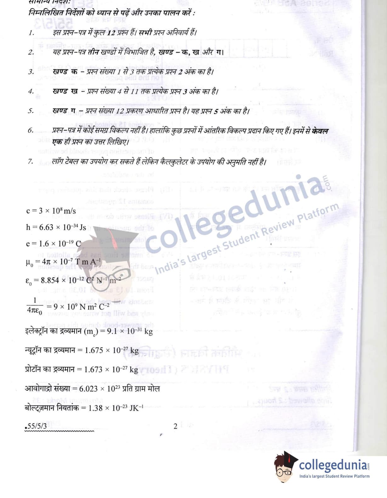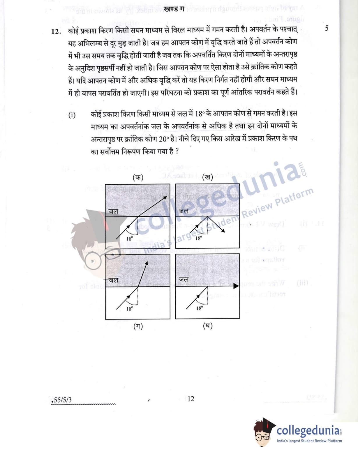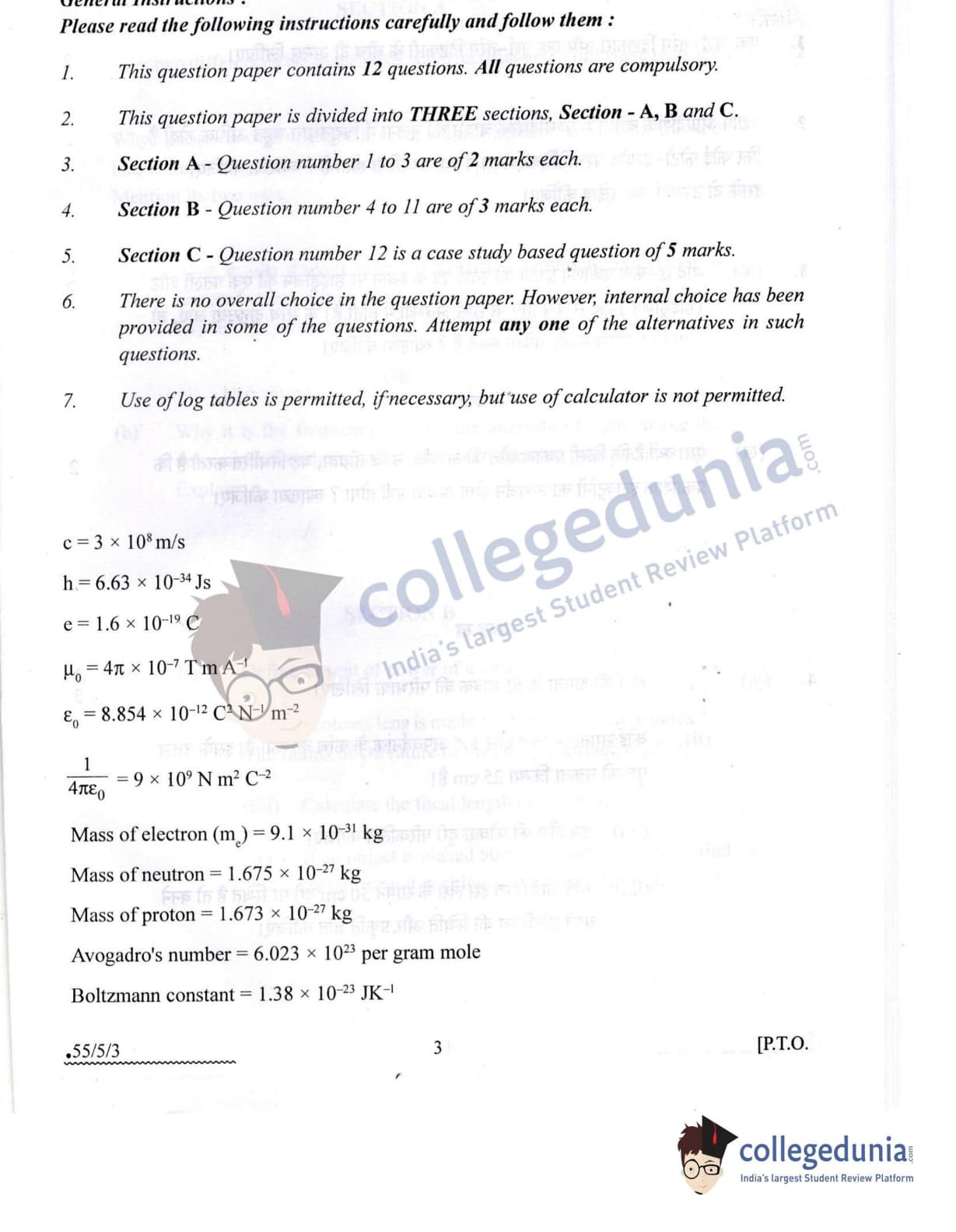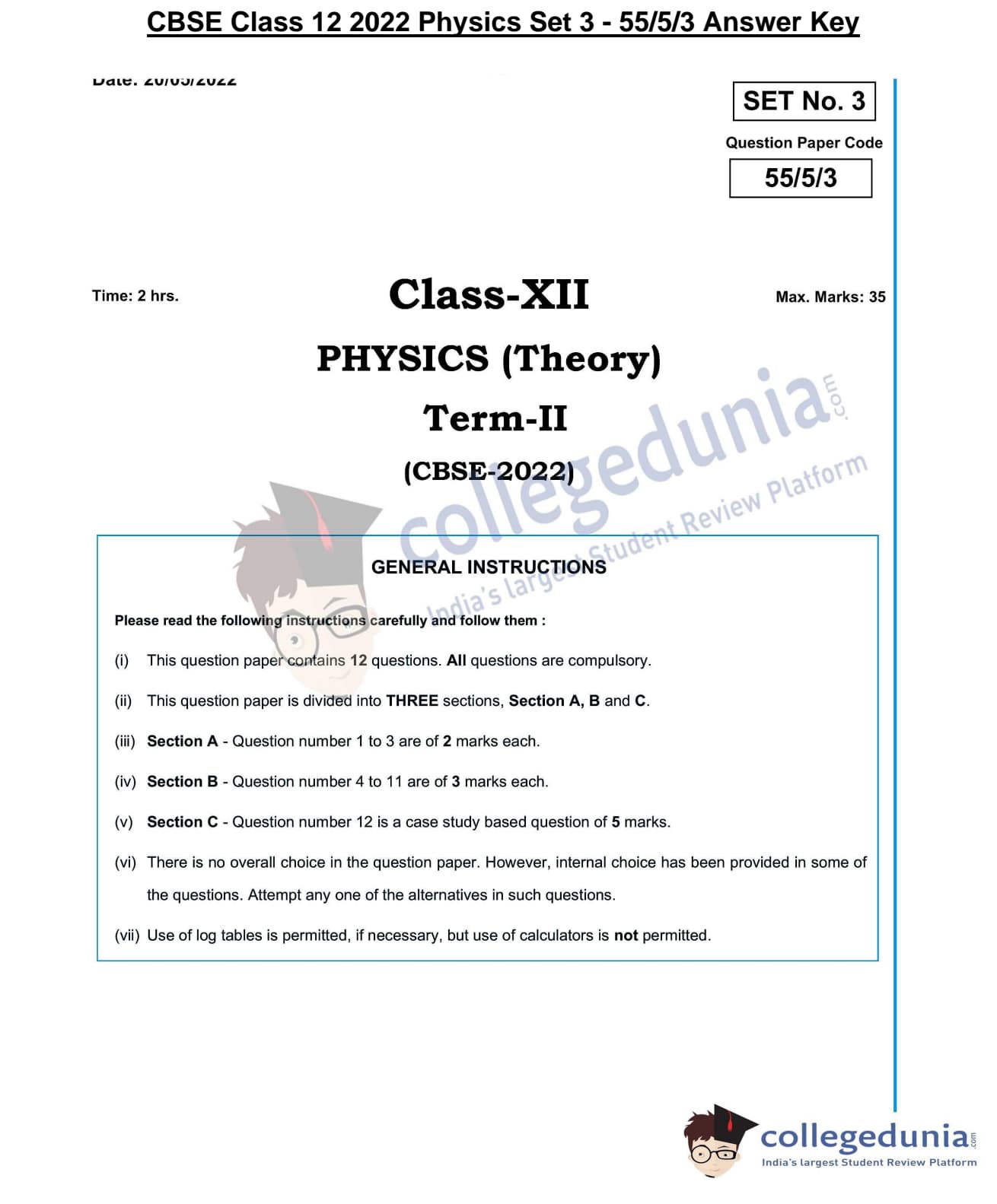 CBSE Class 12 2022 Physics Question Paper Set 3 - 55/5/3 with Answer Key pdf is available for download. The exam was conducted by Central Board of Secondary Education on May 20, 2022 in the Morning Session 10:30 AM to 12:30 PM. The medium of paper was English & Hindi. In terms of difficulty level, CBSE Class 12 Physics paper was of Moderate level. The question paper comprised a total of 12 questions divided among 3 sections.