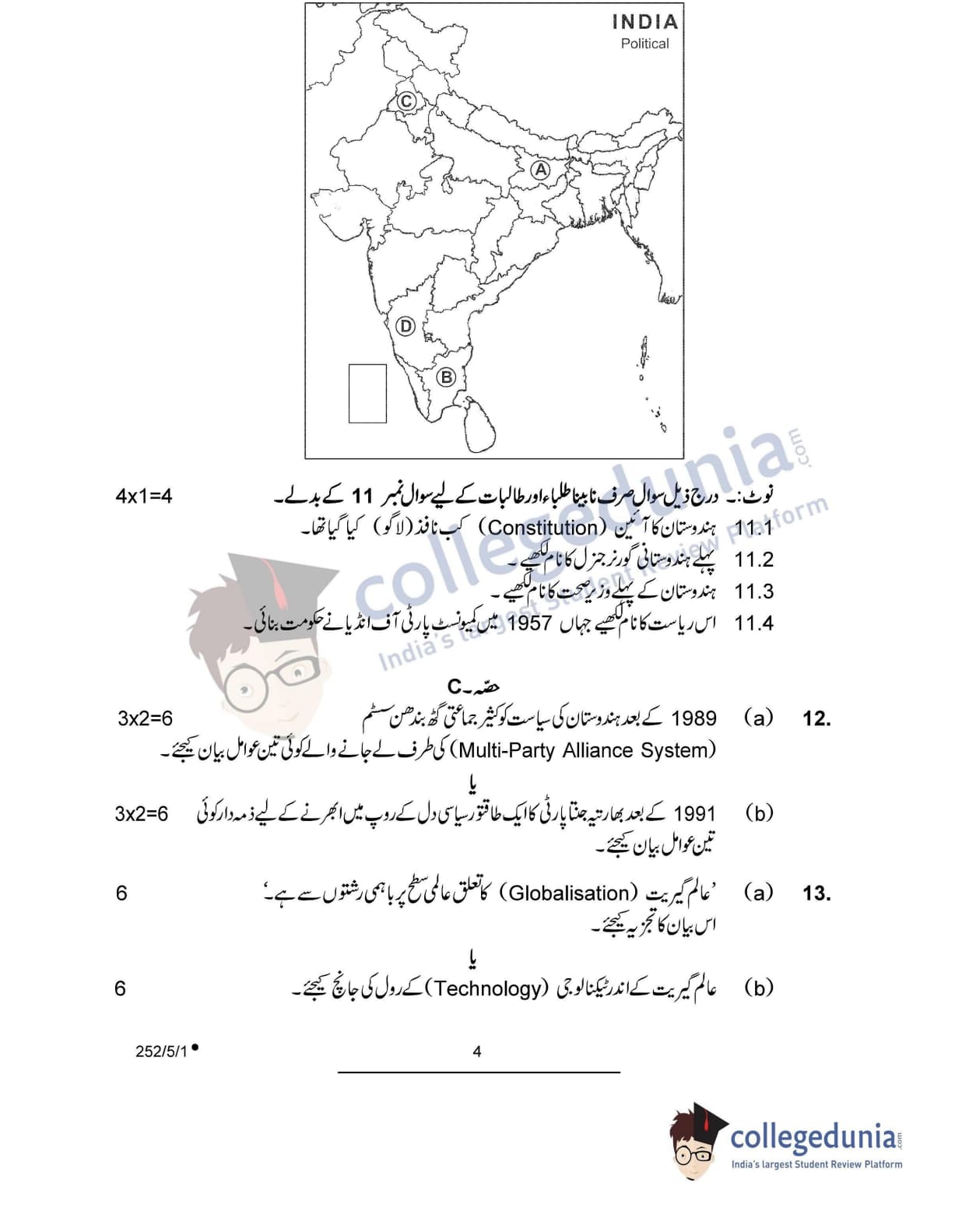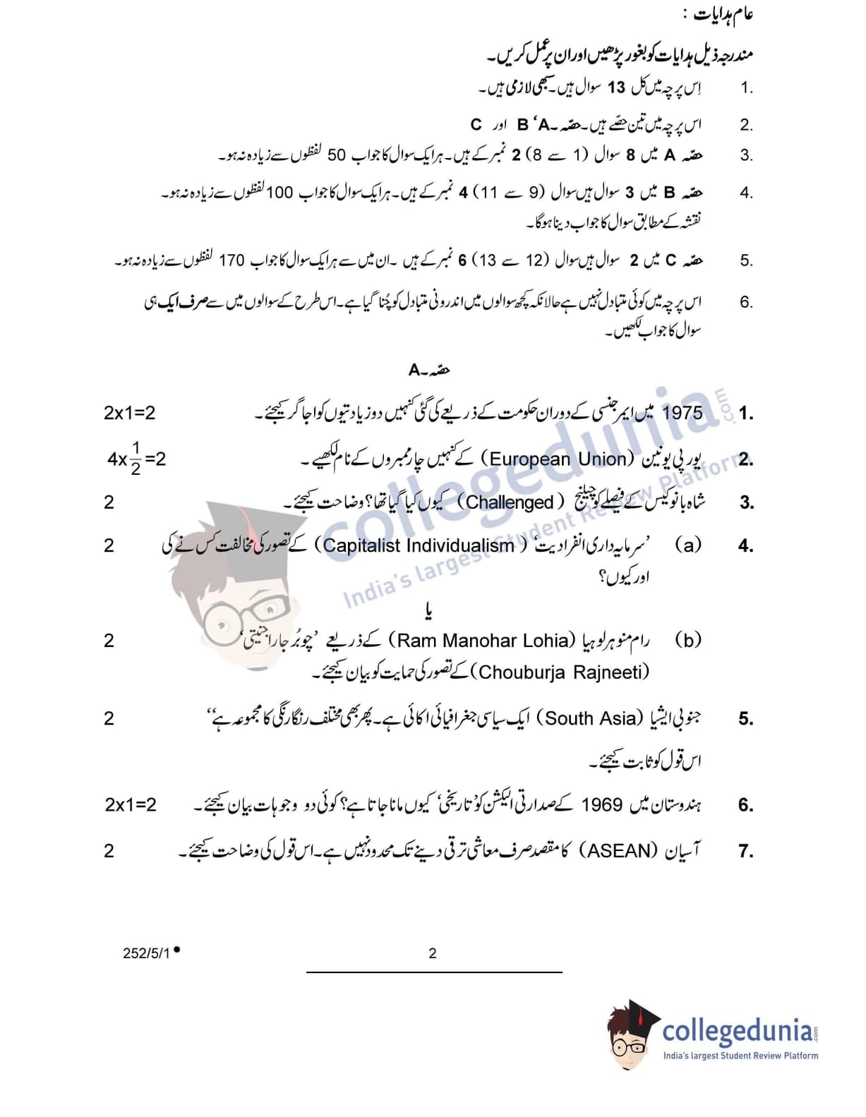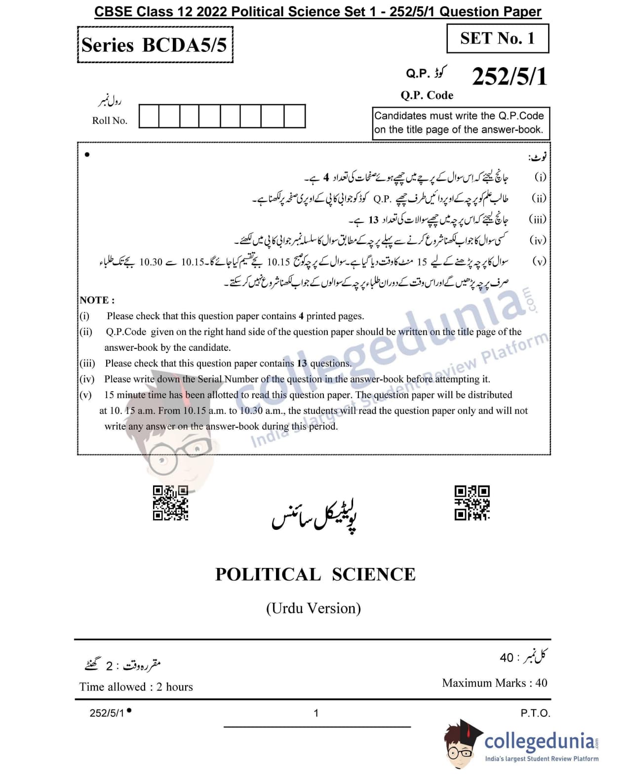 CBSE Class 12 2022 Political Science Question Paper Set 1 - 252/5/1 with Answer Key pdf is available for download. The exam was conducted by Central Board of Secondary Education on May 24, 2022 in the Morning Session 10:30 AM to 12:30 PM. The medium of paper was Urdu In terms of difficulty level, CBSE Class 12 Political Science paper was of Easy level. The question paper comprised a total of 13 questions divided among 3 sections.