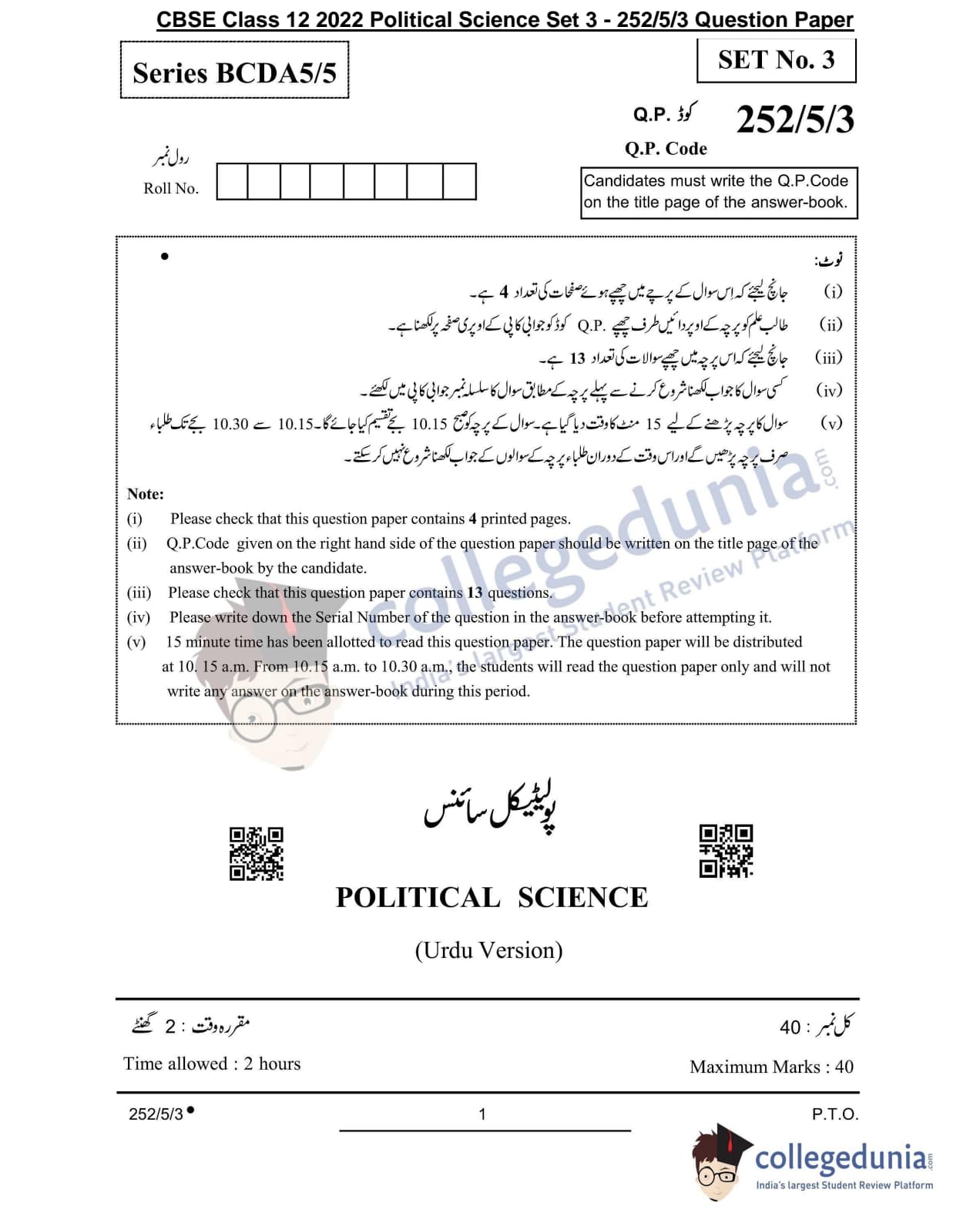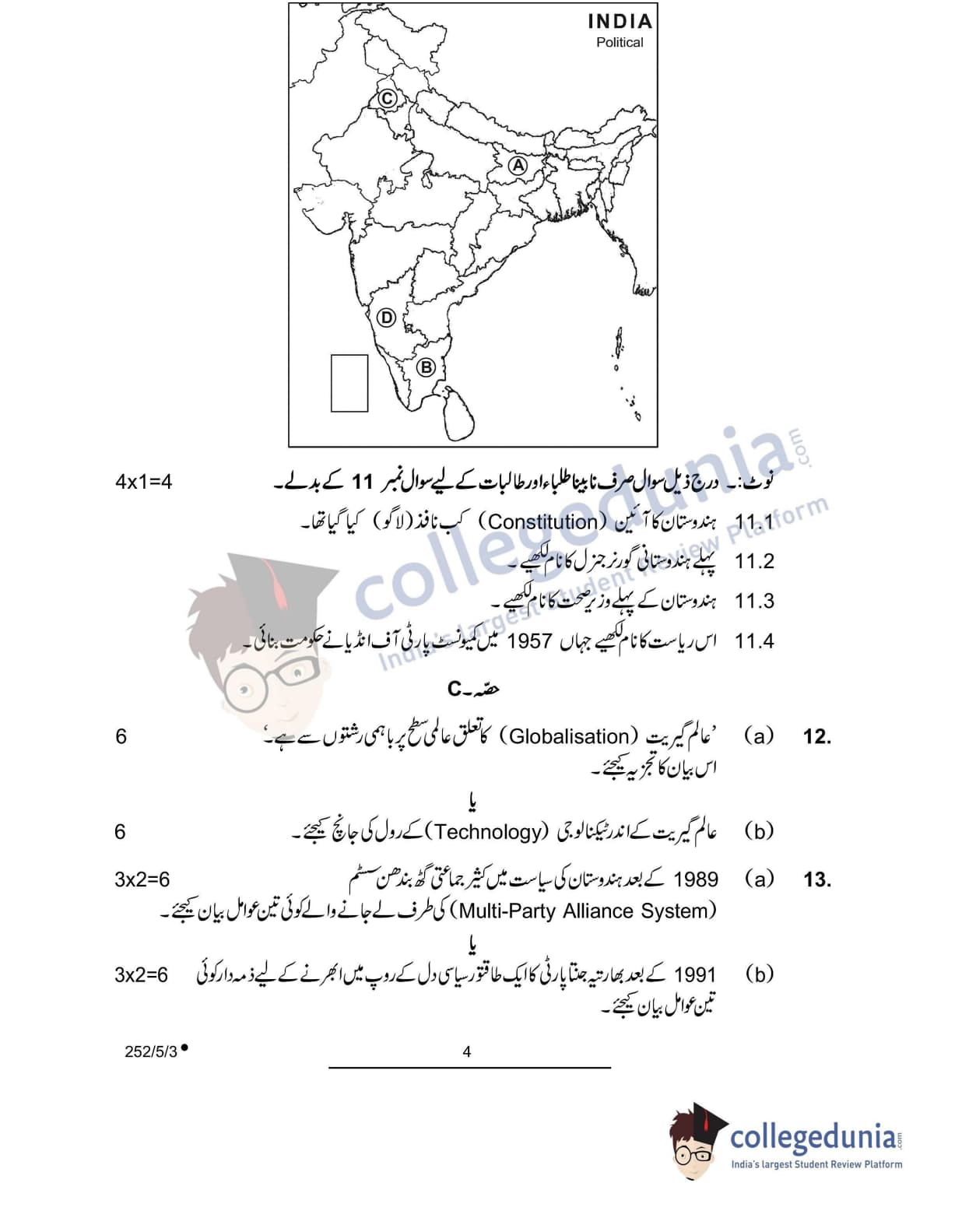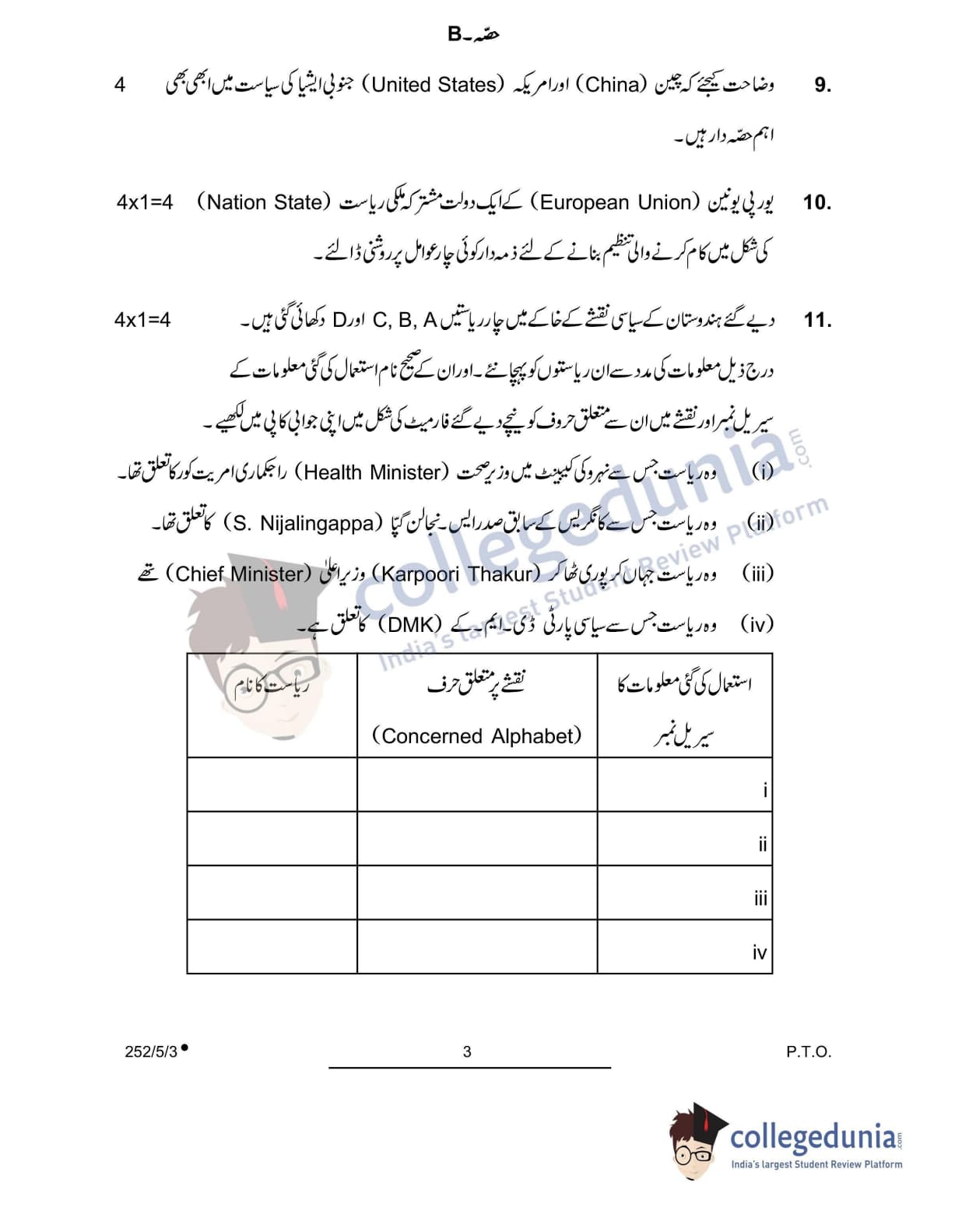 CBSE Class 12 Political Science Question Paper 2022 with Answer Key (May 24, Set 3 - 252/5/3- Morning Session)