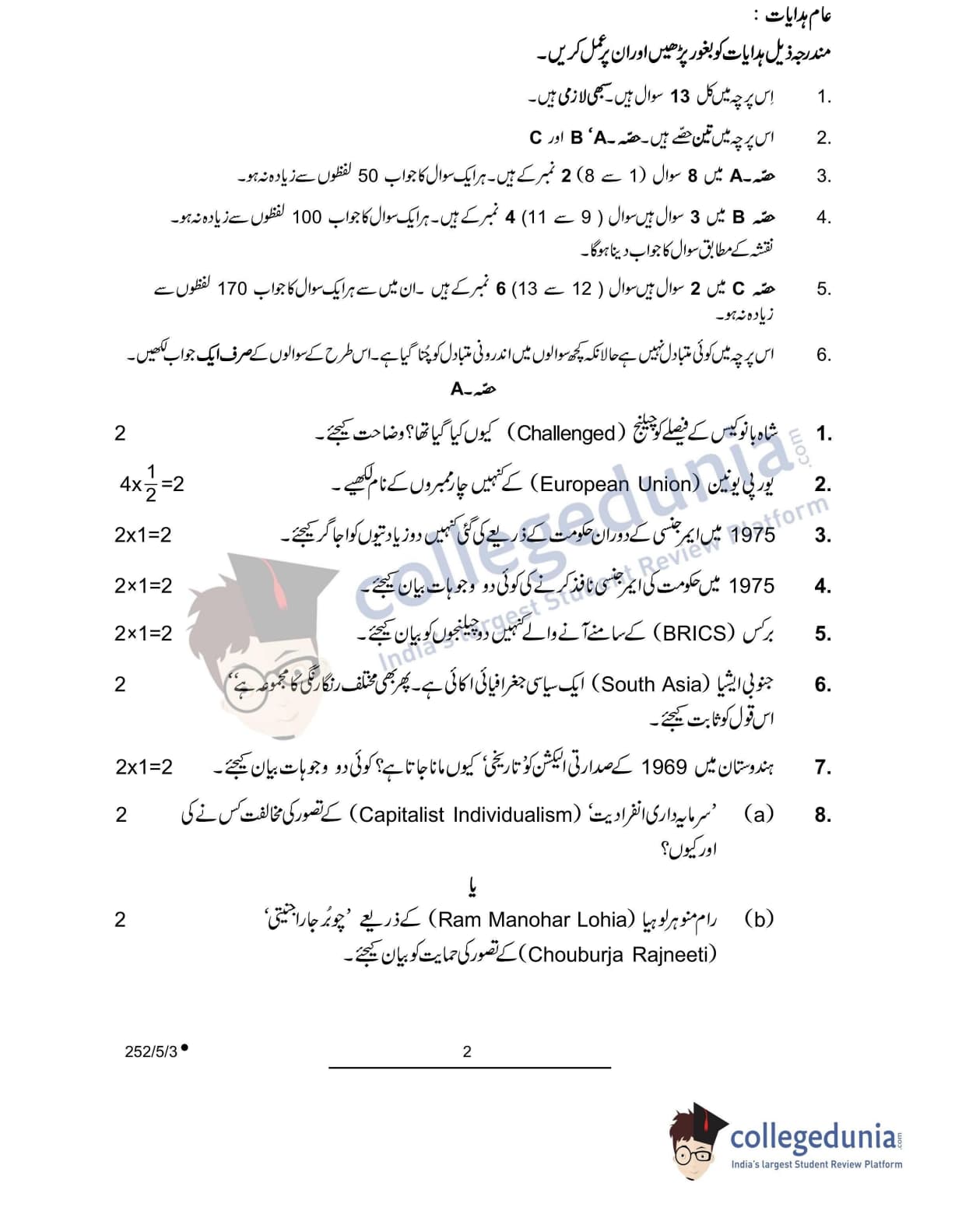 CBSE Class 12 2022 Political Science Question Paper Set 3 - 252/5/3 with Answer Key pdf is available for download. The exam was conducted by Central Board of Secondary Education on May 24, 2022 in the Morning Session 10:30 AM to 12:30 PM. The medium of paper was Urdu. In terms of difficulty level, CBSE Class 12 Political Science paper was of Easy level. The question paper comprised a total of 13 questions divided among 3 sections.