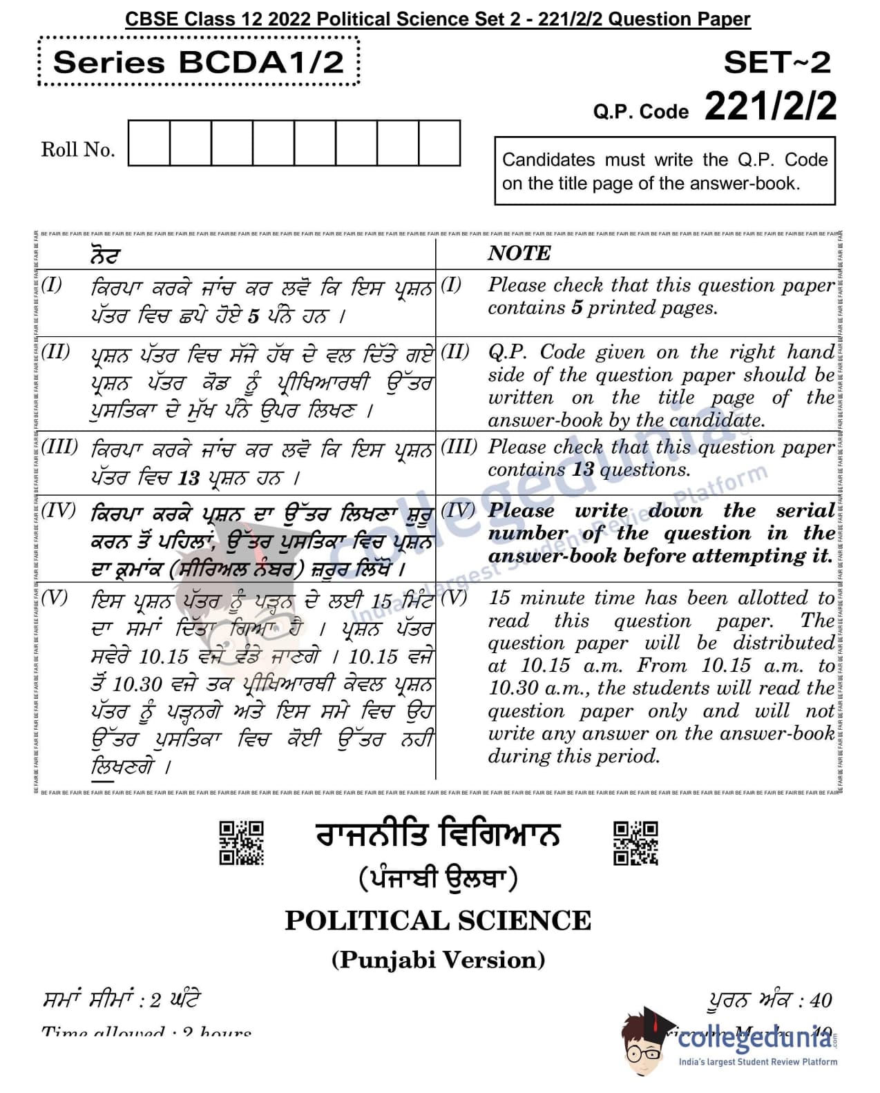 CBSE Class 12 Political Science Question Paper 2022 with Answer Key (May 24, Set 2 - 221/2/2- Morning Session)