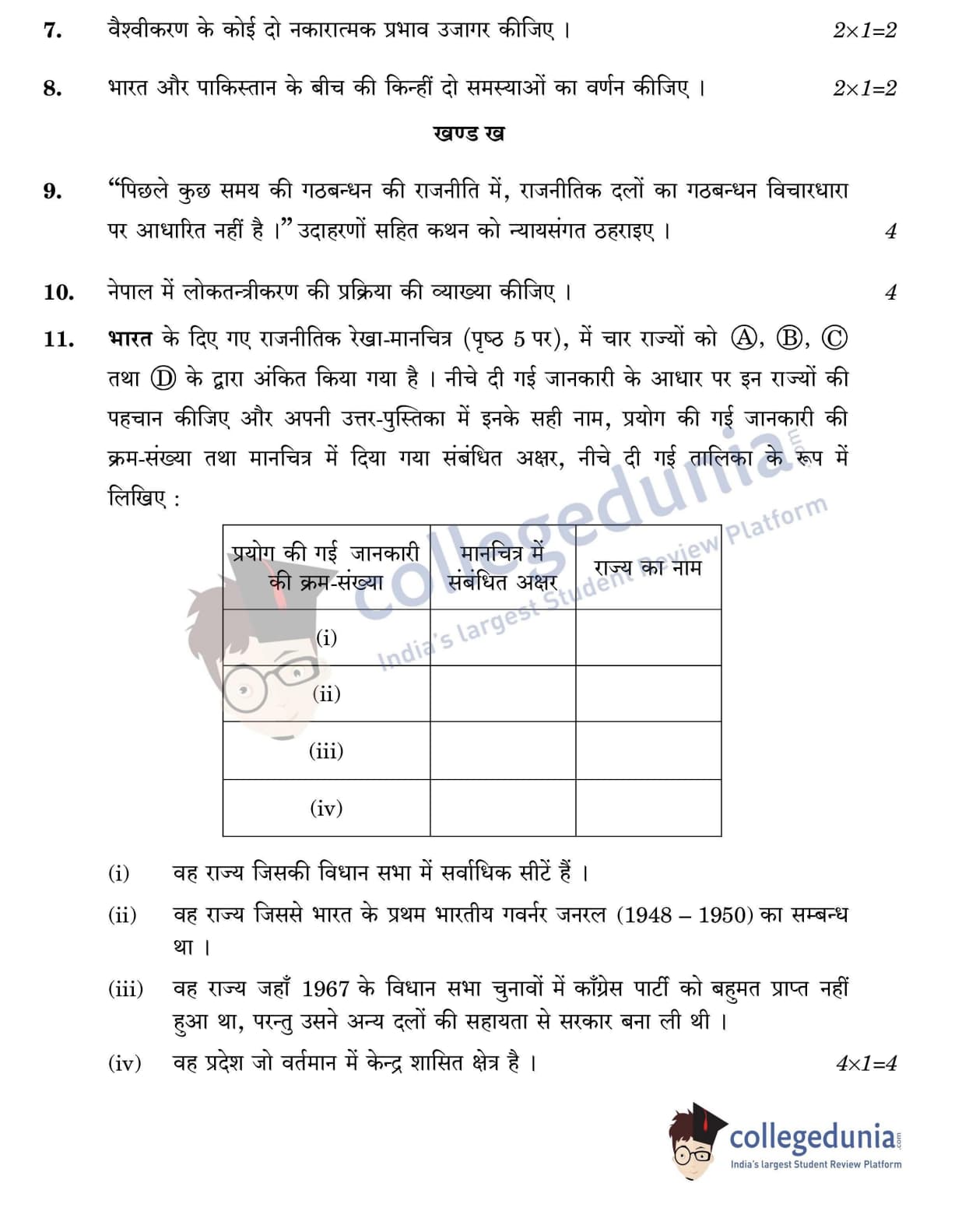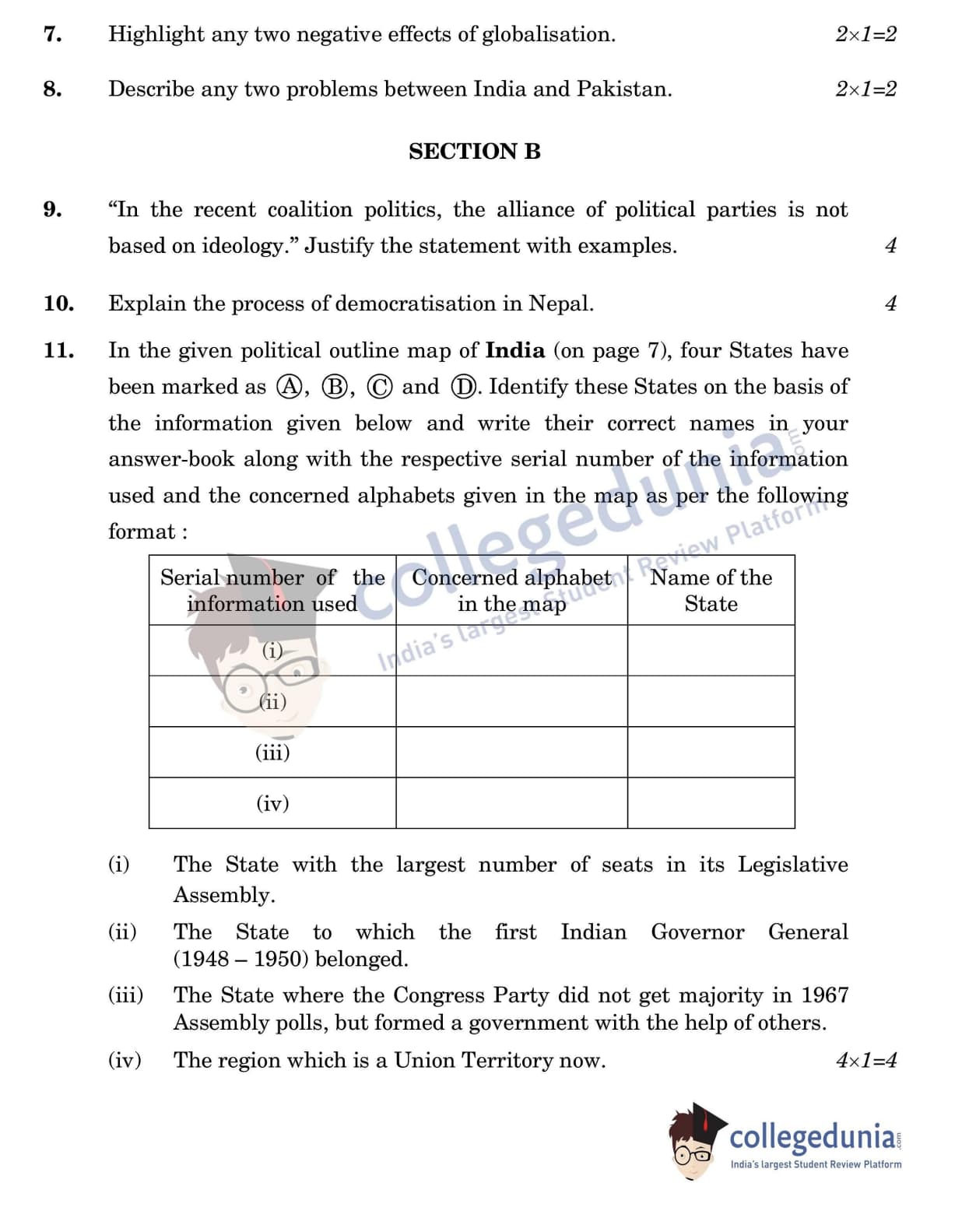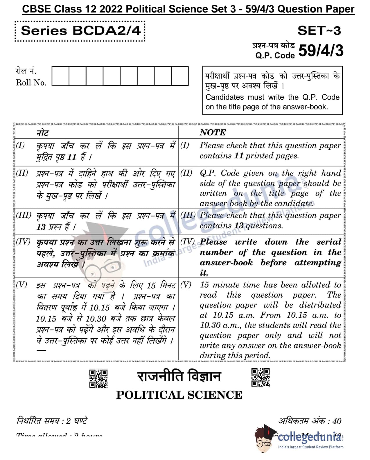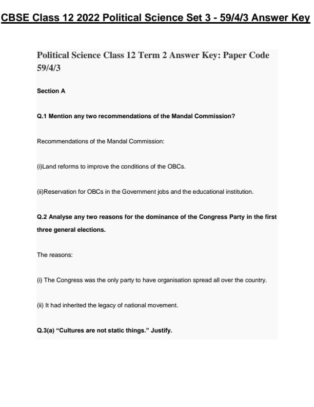 CBSE Class 12 Political Science Question Paper 2022 with Answer Key (May 24, Set 3 - 59/4/3- Morning Session)