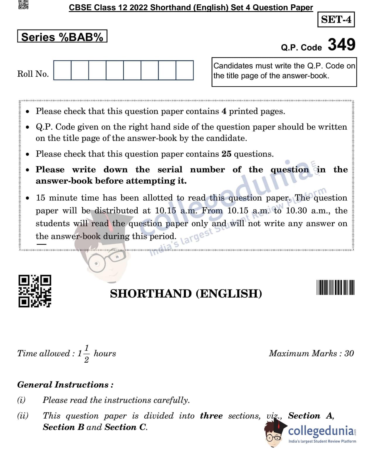 CBSE Class 12 2022 Shorthand English Question Paper Set 4 with Answer Key pdf is available for download. The exam was conducted by Central Board of Secondary Education on June 4, 2022 in the Morning Session 10:30 AM to 12:00 PM. The medium of paper was English. The question paper comprised a total of 25 questions divided among 3 sections.