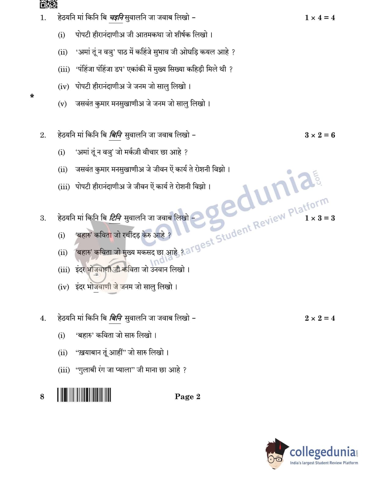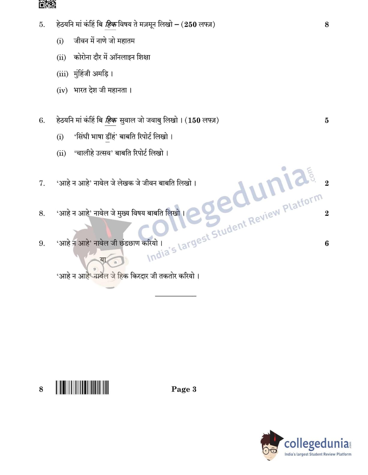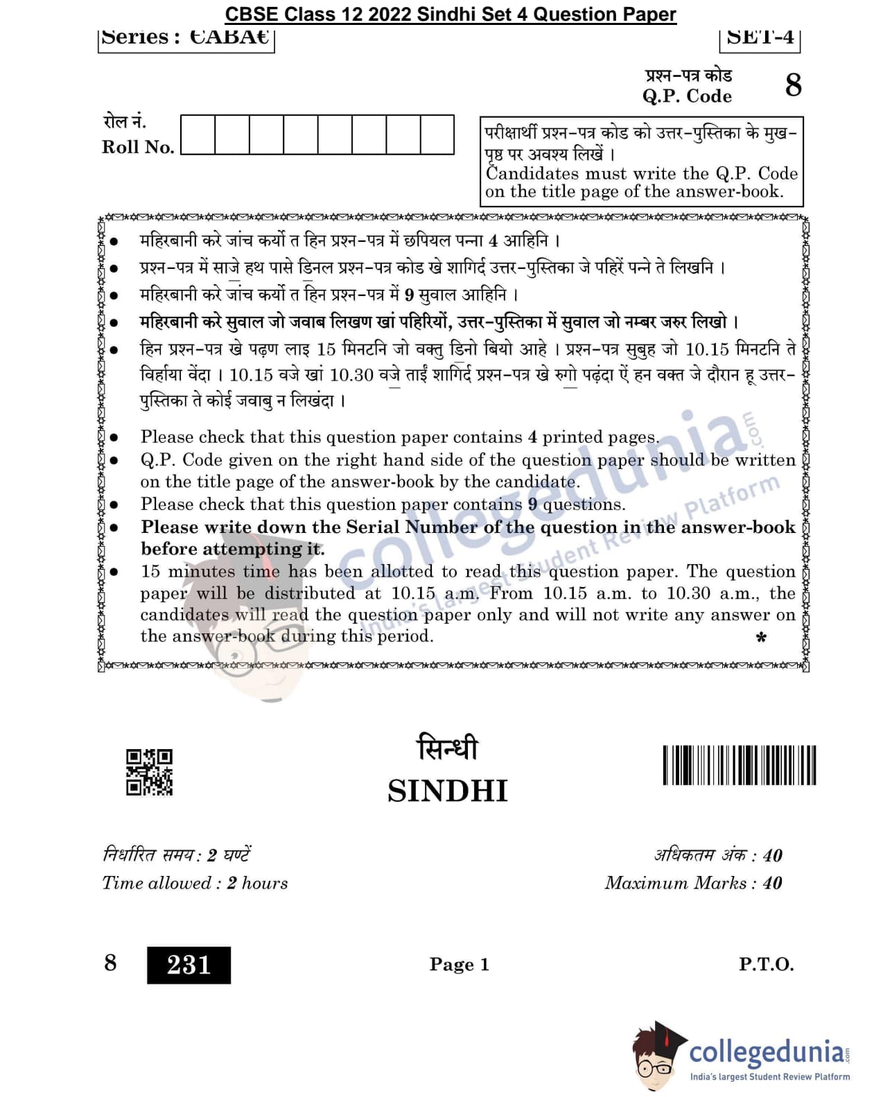 CBSE Class 12 Sindhi Question Paper 2022 with Answer Key (May 11, Set 4- Morning Session)