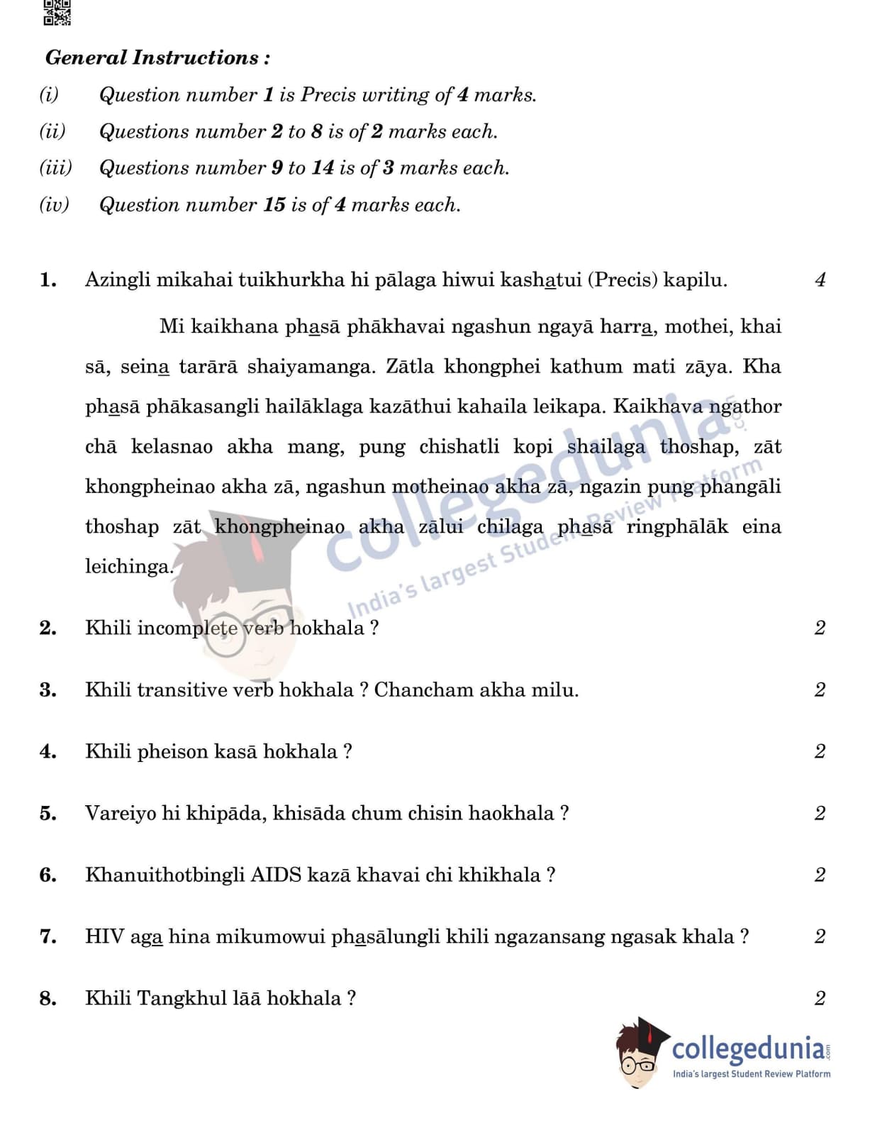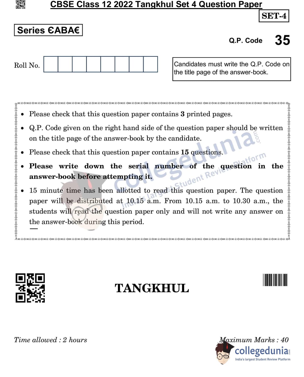CBSE Class 12 2022 Tangkhul Question Paper Set 4 with Answer Key pdf is available for download. The exam was conducted by Central Board of Secondary Education on May 11, 2022 in the Morning Session 10:30 AM to 12:30 PM. The medium of paper was Tangkhul. The question paper comprised a total of 15 questions.