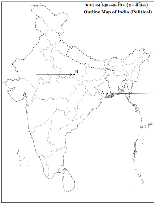 On the same political outline map of India, two places which were under the control of British during 1857 have been marked as A and B. Identify them and write their names on the lines drawn near them.
