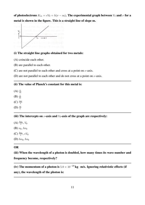 (iv) The momentum of a photon is \( 5.0 \times 10^{-29} \, kg \cdot m/s \). Ignoring relativistic effects (if any), the wavelength of the photon is: