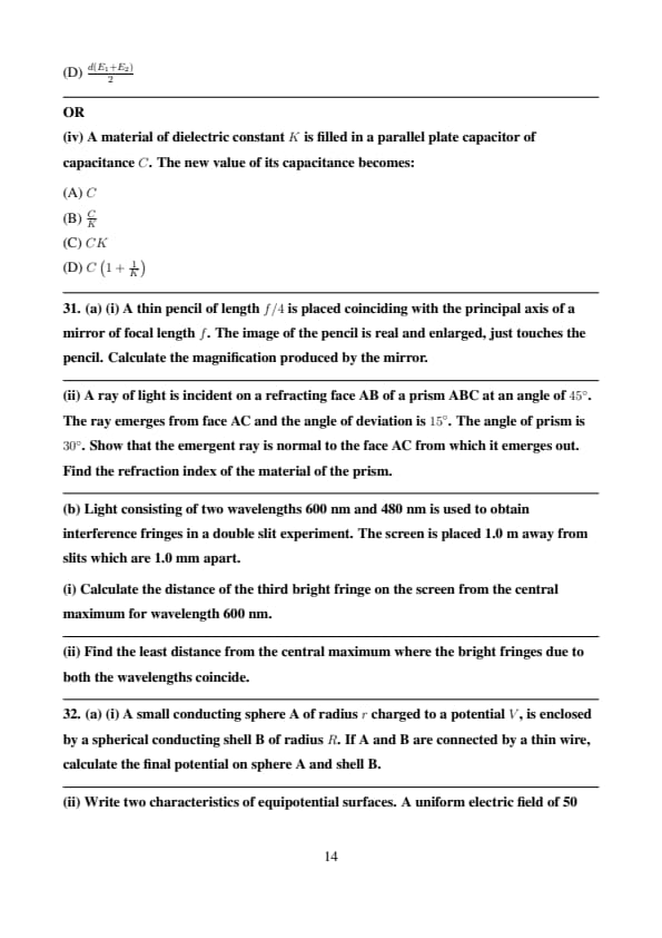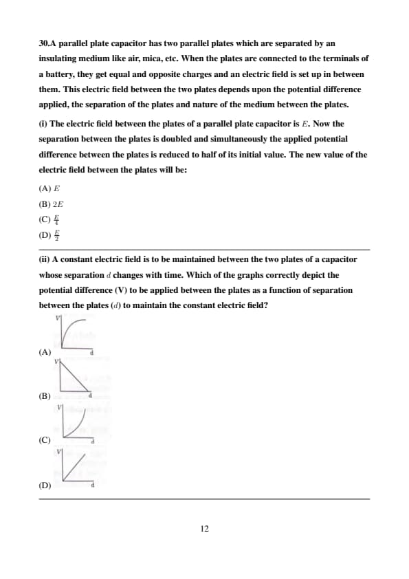 (i) The electric field between the plates of a parallel plate capacitor is \( E \). Now the separation between the plates is doubled and simultaneously the applied potential difference between the plates is reduced to half of its initial value. The new value of the electric field between the plates will be: