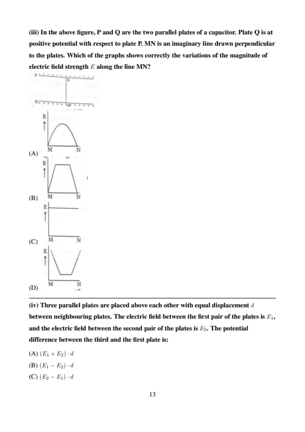 (iii) In the above figure, P and Q are the two parallel plates of a capacitor. Plate Q is at positive potential with respect to plate P. MN is an imaginary line drawn perpendicular to the plates. Which of the graphs shows correctly the variations of the magnitude of electric field strength \( E \) along the line MN?