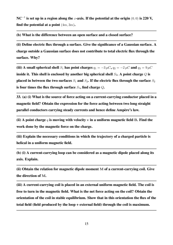 (b) (iii) A small spherical shell \( S_1 \) has point charges \( q_1 = -3 \, \mu C \), \( q_2 = -2 \, \mu C \) and \( q_3 = 9 \, \mu C \) inside it. This shell is enclosed by another big spherical shell \( S_2 \). A point charge \( Q \) is placed in between the two surfaces \( S_1 \) and \( S_2 \). If the electric flux through the surface \( S_2 \) is four times the flux through surface \( S_1 \), find charge \( Q \).