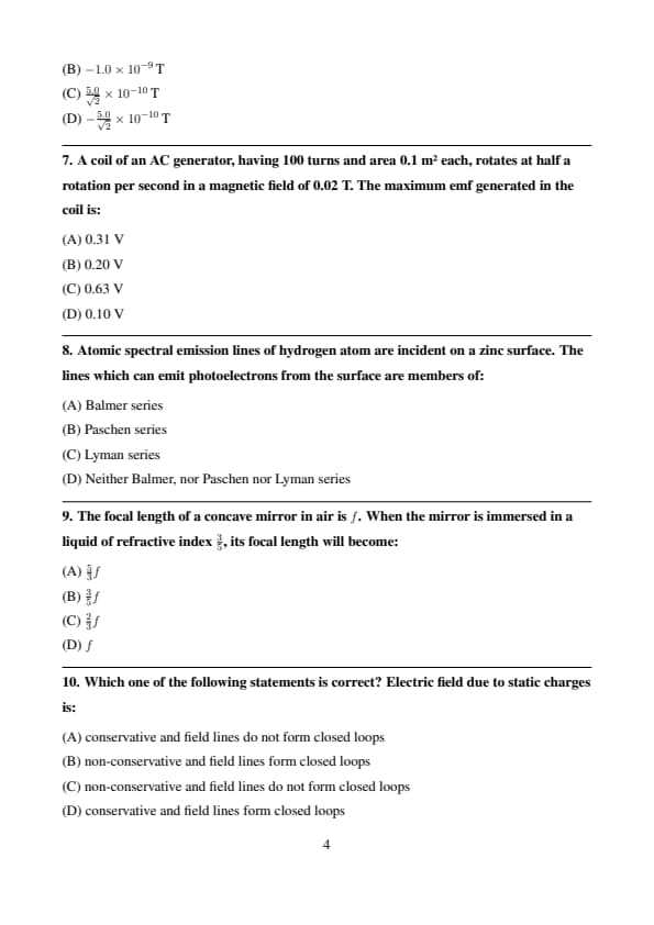 A coil of an AC generator, having 100 turns and area 0.1 m² each, rotates at half a rotation per second in a magnetic field of 0.02 T. The maximum emf generated in the coil is:
