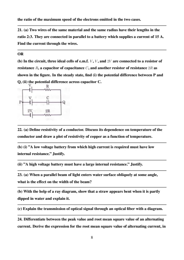 In the circuit, three ideal cells of e.m.f. \( V \), \( V \), and \( 2V \) are connected to a resistor of resistance \( R \), a capacitor of capacitance \( C \), and another resistor of resistance \( 2R \) as shown in the figure. In the steady state, find (i) the potential difference between P and Q, (ii) the potential difference across capacitor C.