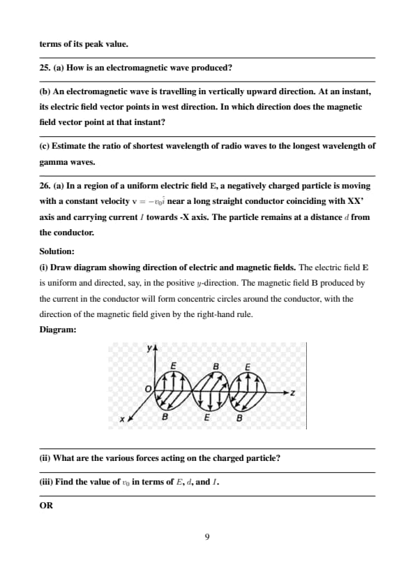 (a) In a region of a uniform electric field \( \mathbf{E} \), a negatively charged particle is moving with a constant velocity \( \mathbf{v} = -v_0 \hat{i} \) near a long straight conductor coinciding with XX' axis and carrying current \( I \) towards -X axis. The particle remains at a distance \( d \) from the conductor.